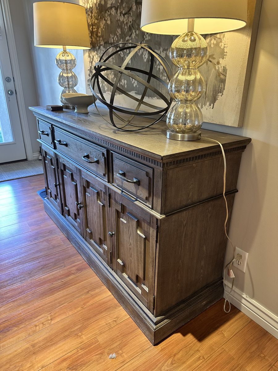 Used good condition. A few rubbings on top and a small chew (dang puppy) on bottom corner where I filled it in with similar paint color. 18” deep, 64” wide and 35” tall. OBO you take it all for $225 (wall art, 2 lamps, table)