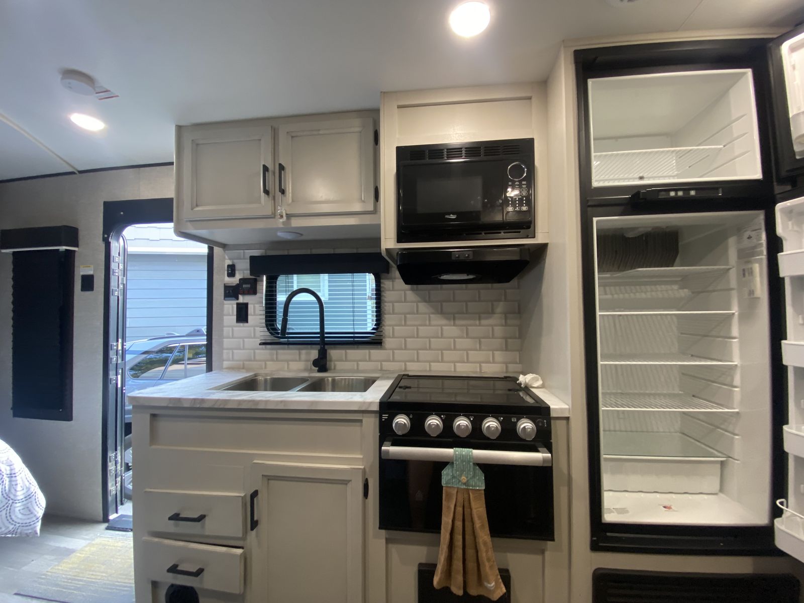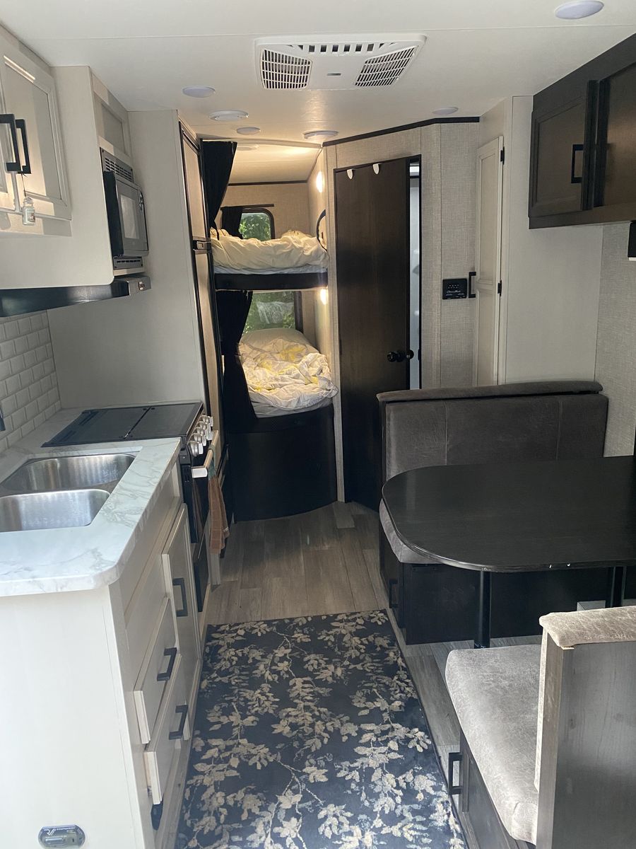 -Double axle, 8-ft wide, sleeps up to 7 (queen bed, double full sized bunk, dinette)