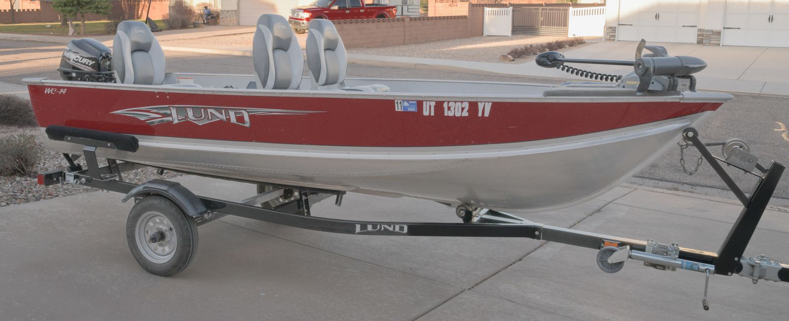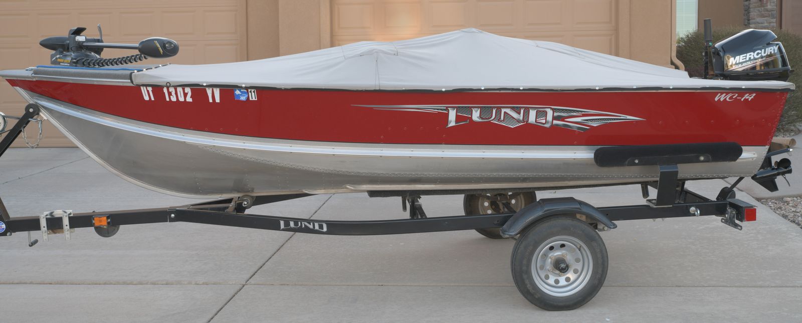 2014 Lund WC-14 fishing boat with folding-tongue trailer, in Excellent condition. Mercury 9.9 Horsepower 4-stroke motor, custom snap on cover for highway use, 3 comfortable seats, Minn Kota trolling motor with wireless remote control, rod holders, Garmin color depth/fish finder. This boat has been garaged every night of its’ life and has never been trailered or fished outside of Southern Utah. Located in Cedar City.
