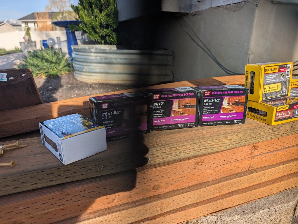 diy and construction materials screws, nails, etc 5$ lb for new screws, 20$ for bucket o nails green cords 15 ea Ridgid ups cord 30 deal for roofing nails 10 per box all for 100 Phil in Lehi 8017225800