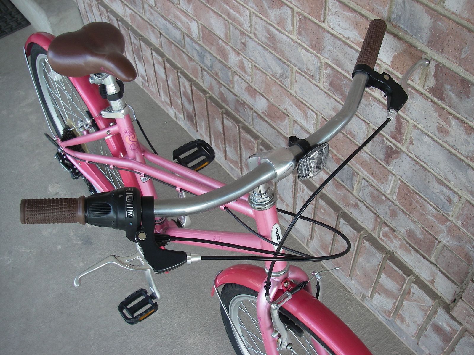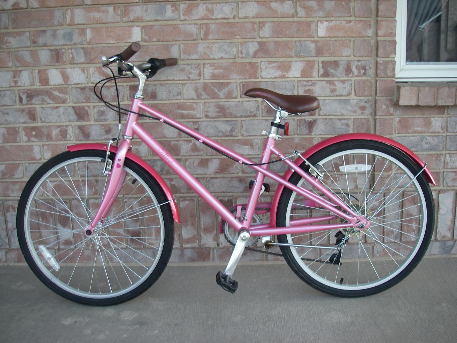 Girl's 24" (wheel size) SCHWINN SALINA Flat-Bar Road / Street Bike, Classic MIXTE Frame, 7 Speed, Fenders, Two-Tone Pink, Leather style saddle, V-Brakes. Aluminum Rims, Hubs, HB Neck, 3-Piece Crank Arms. Aprx year made was 2021. Best use is for cruising the neighborhood in style. Typically fits riders ages 8-12, between 51-59˝ tall.