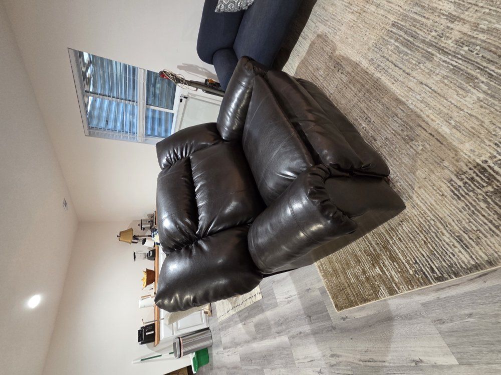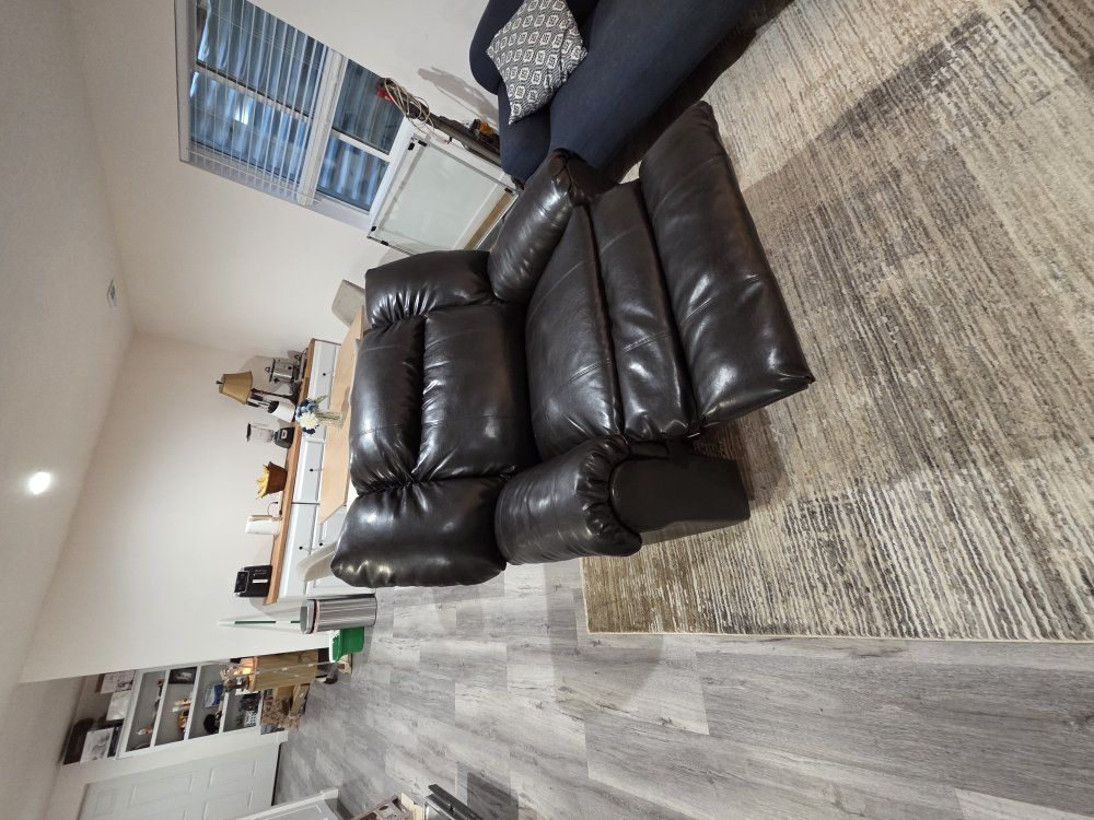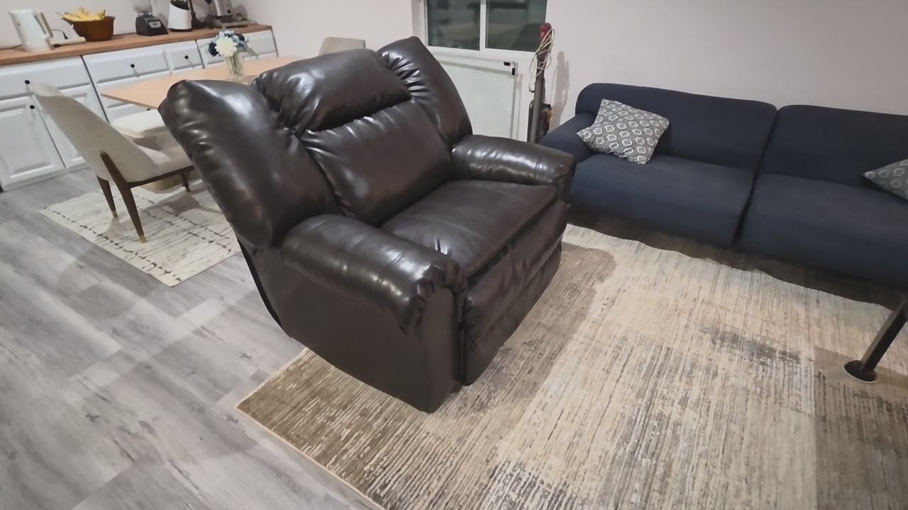 GooglePayVery larger recliner can comfortably sit 2 average sized adults for cuddling. Manually reclines with hidden lever. Does not rock, just 2 positions when reclines (feet up and fully reclined) Faux leather (microfiber)