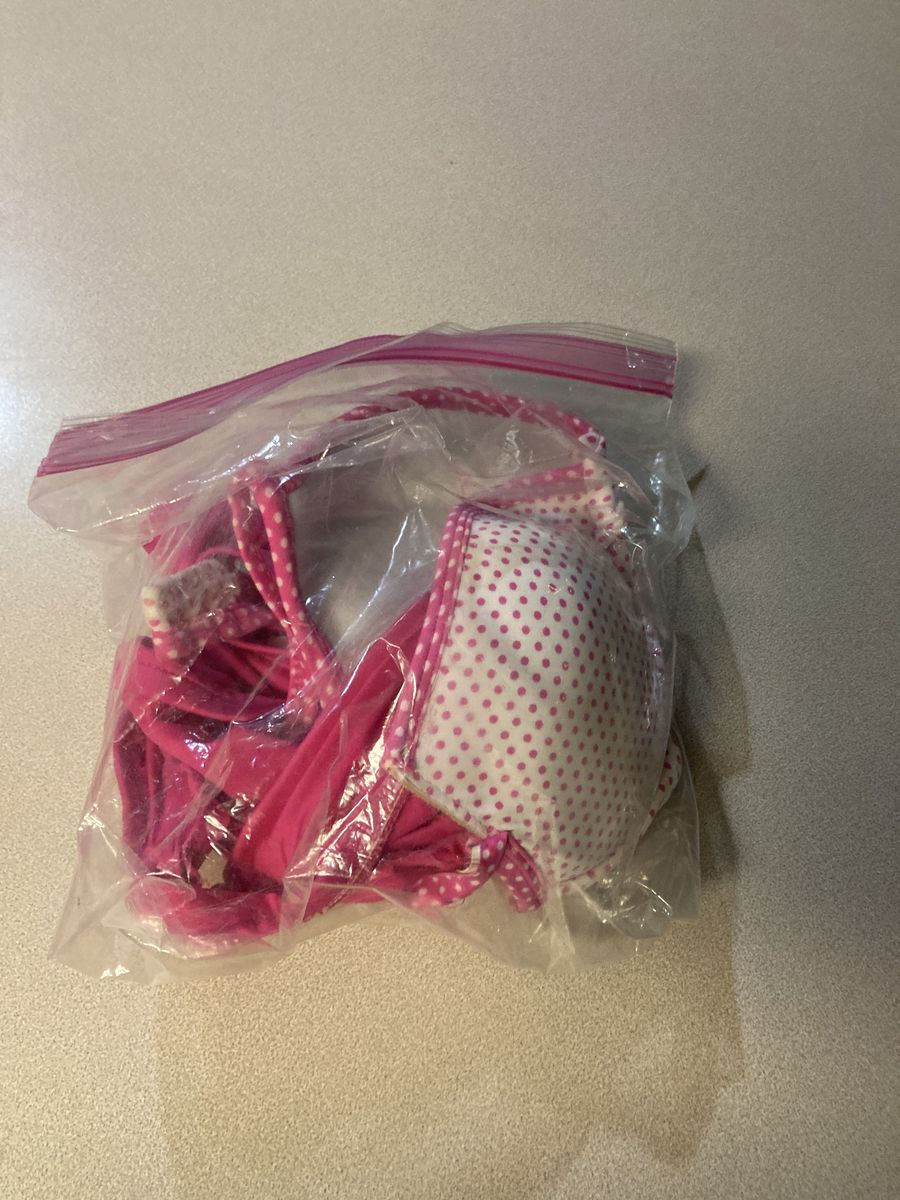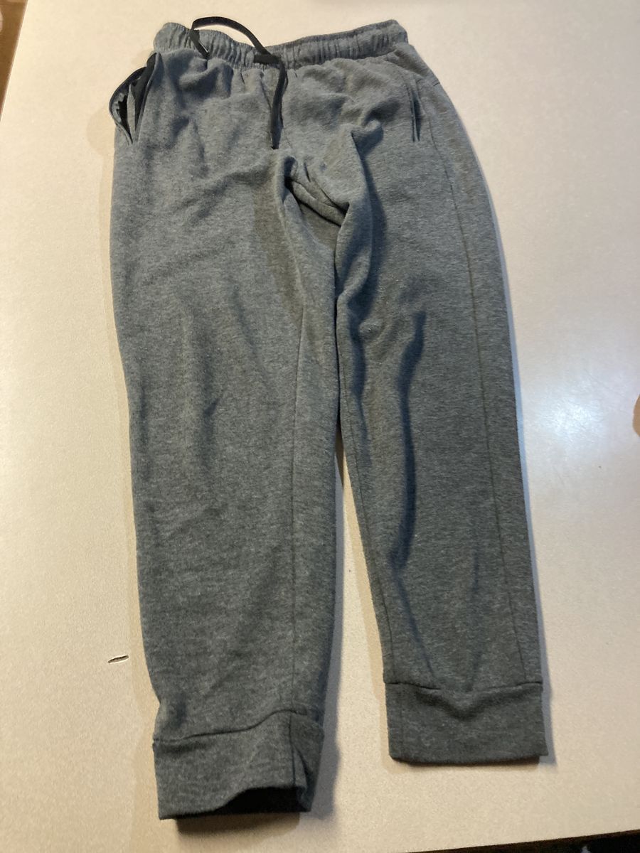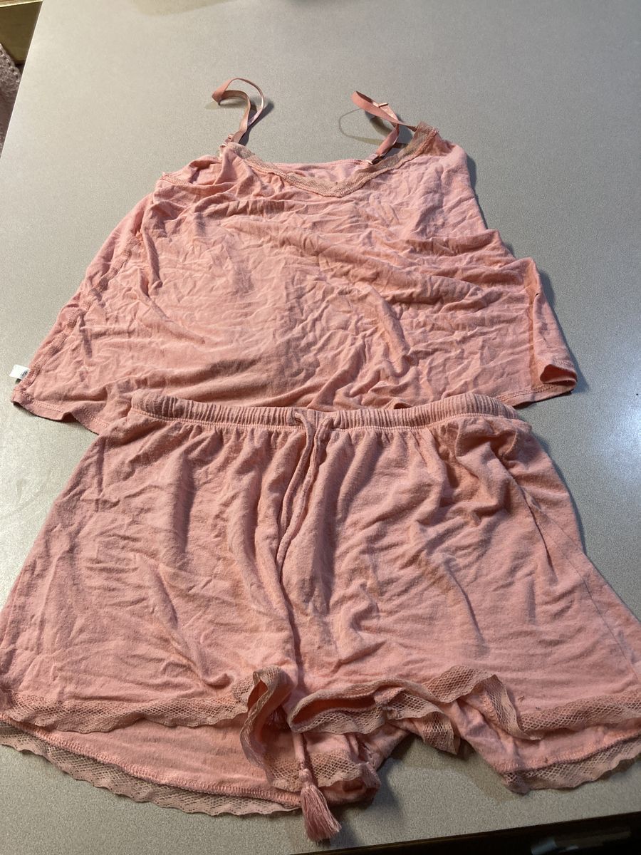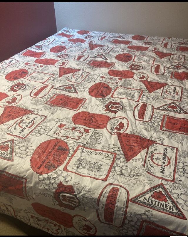 Table cloth with wine labels. Plaid tie up curtains, bag with bird on it, large men’s fila quarter zip. Small women’s pj set, small men’s sweats, asst glassware, Nike sneakers size women’s 8, base, charging bank, throw, stuffed dog, dishwasher detergent, hair clip ,pan, purse