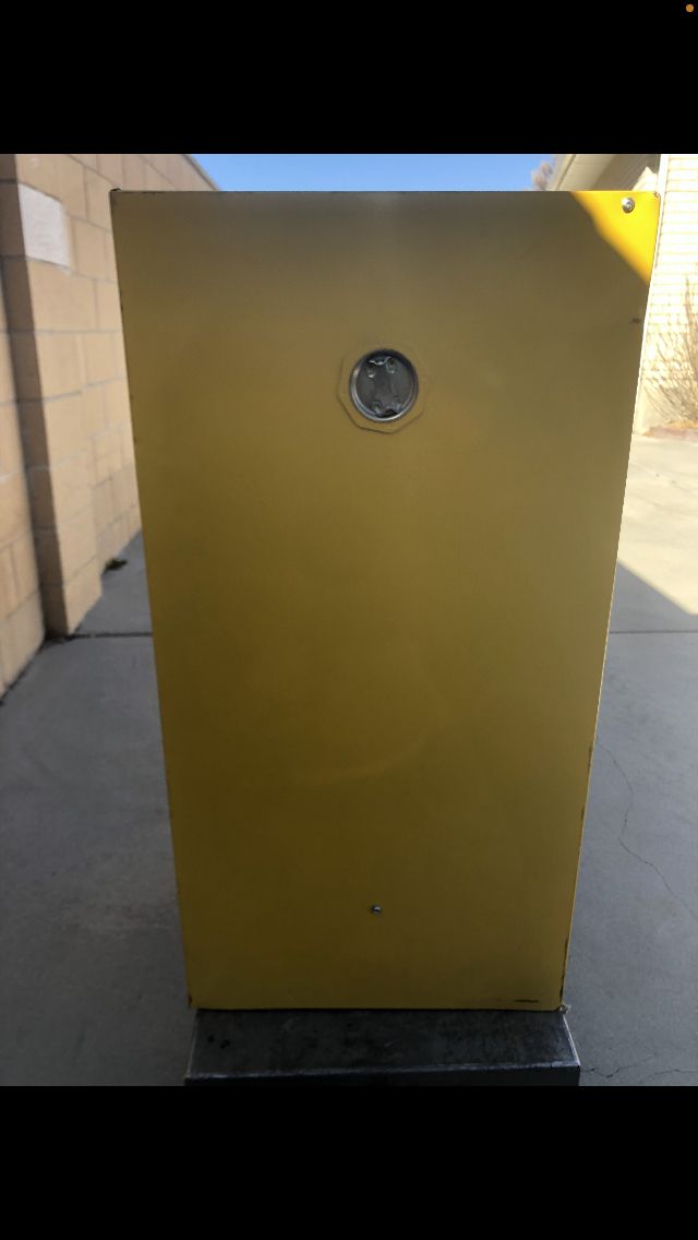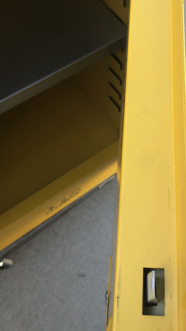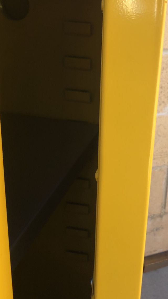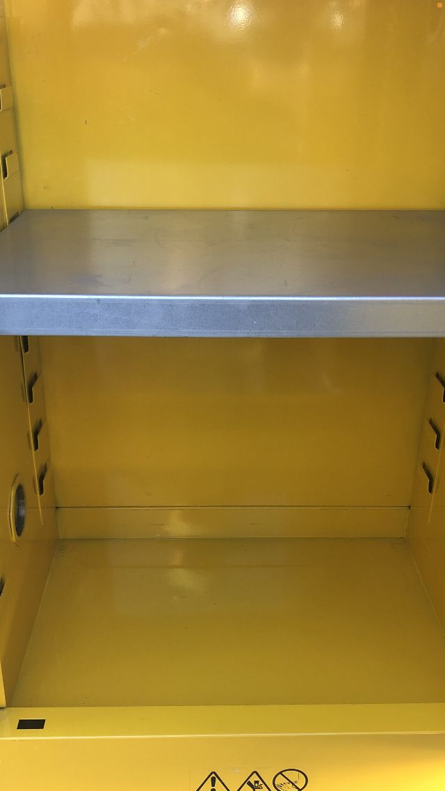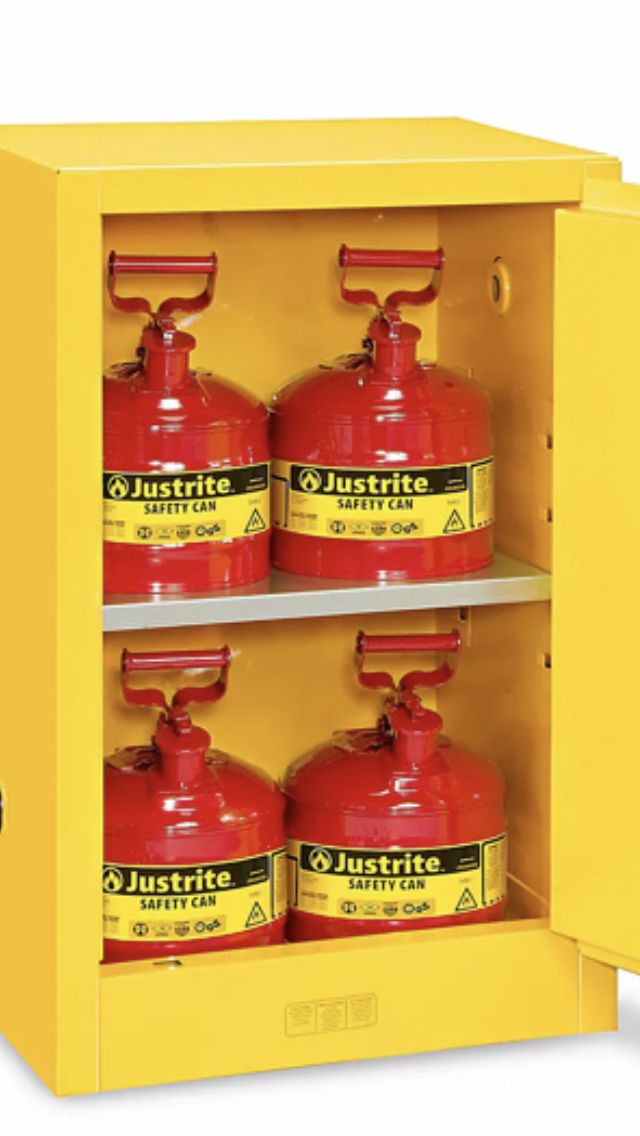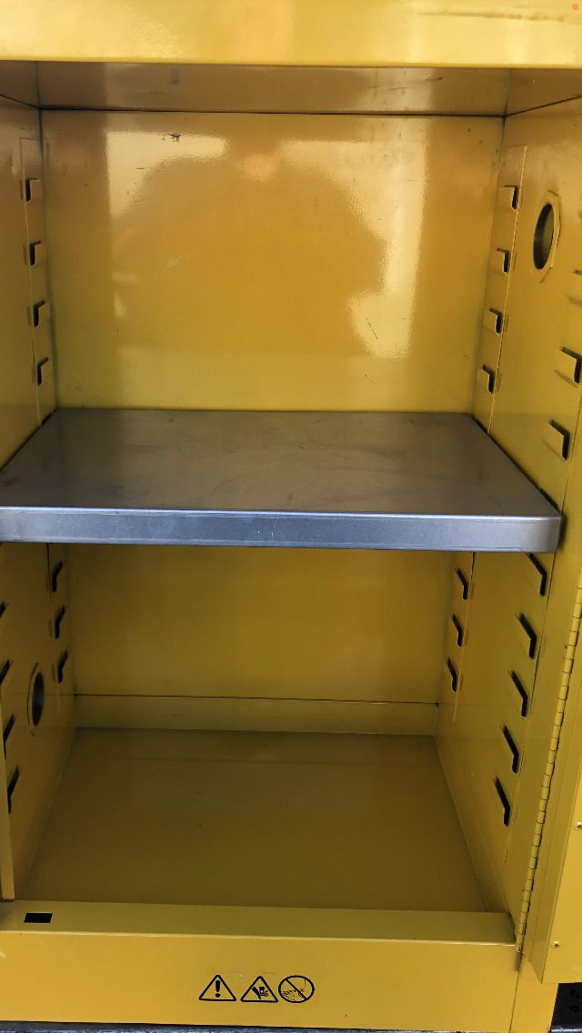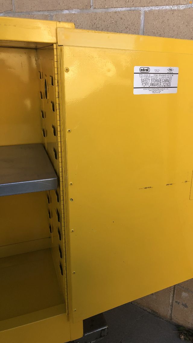 Edsel/ Safety Storage Cabinet for Flammable liquids #SC12F. 12 gal. 23x 18x 35 / locking cabinet with keys, Galvanized shelve rest on fixed shelf supports adjustable on 2 1/2” centers. Vent covers are installed on both inside and outside of the cabinet. Cabinet leg levelers enable you to level the cabinet at 4 points New!! $ 200.00!!