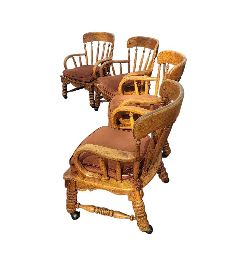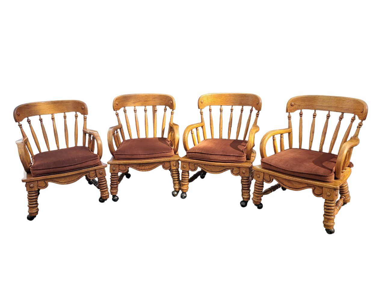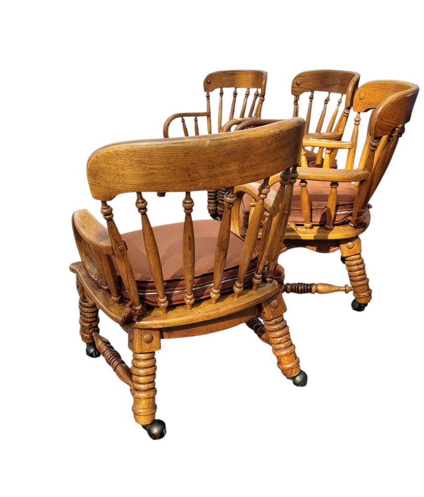on casters | wheels | removeable brown padded seats | spindle | Windsor | bentwood arms | game chairs | poker | armchairs | stunning | club chairs