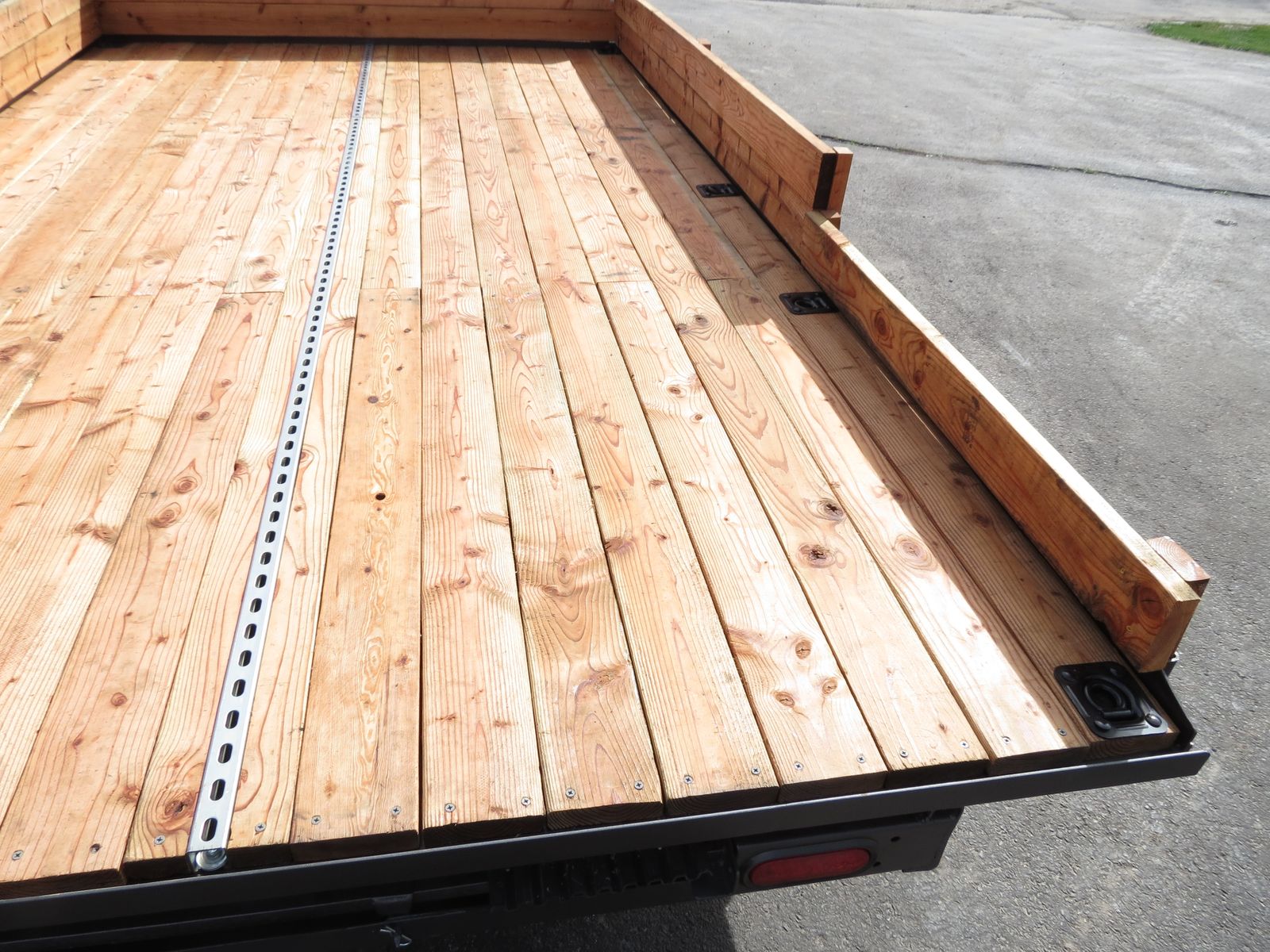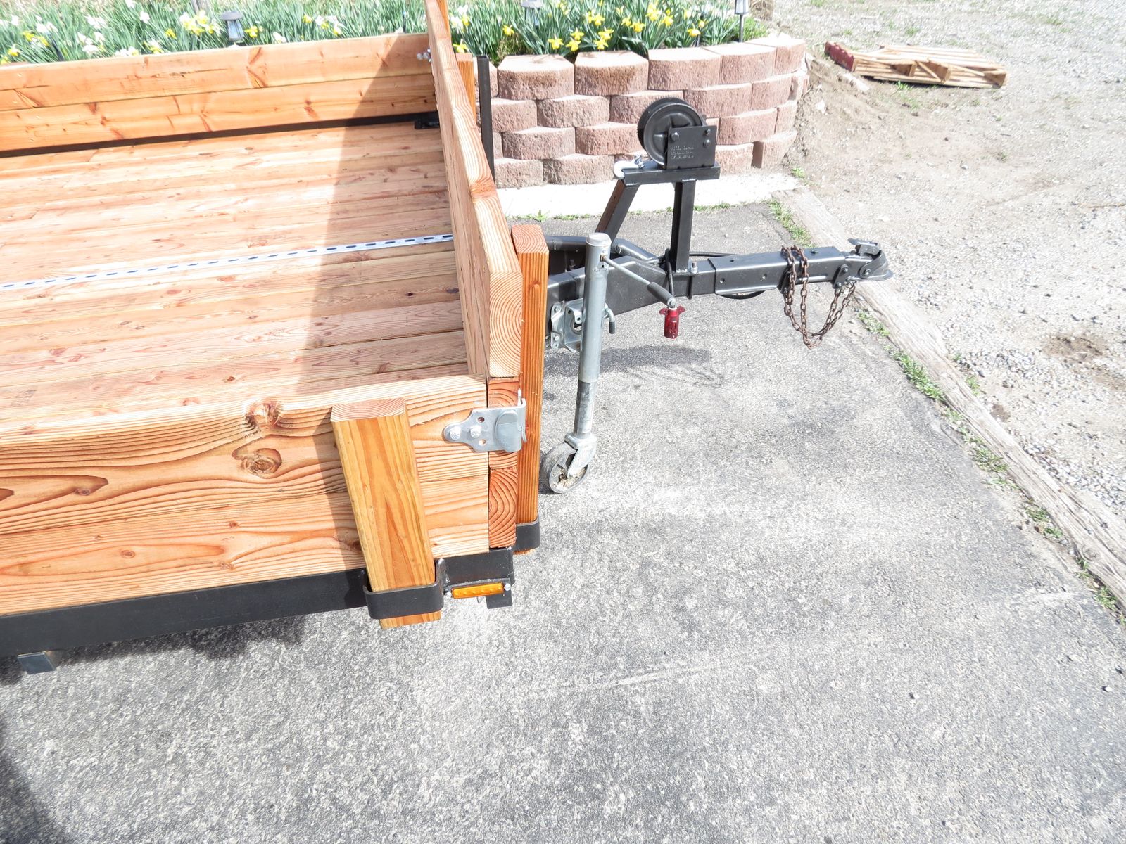 The 2X6 decking was treated with Thomopsons Water Seal on all sides and ends before being installed. There are heavy duty tie downs, secured to the frame, in all four corners and two more, secured to the frame, on each side. There is also a full length tie down bar in the middle of the trailer. The sides are easily removable. There is a ramp that slides into the back. The winch works very well. The wheel bearings are new, the tires are new and load range D. Better than normal C. Their speed rating is M, which is 81 MPH. The wiring is all new and the connections have heat shrink around them for waterproofing. This trailer pulls very easily and does not wander or bounce.