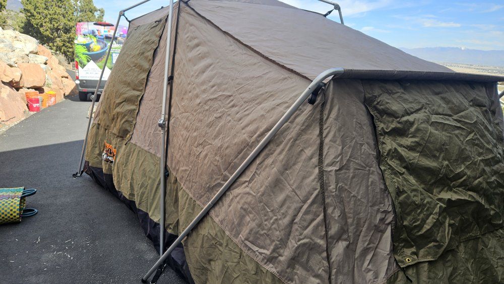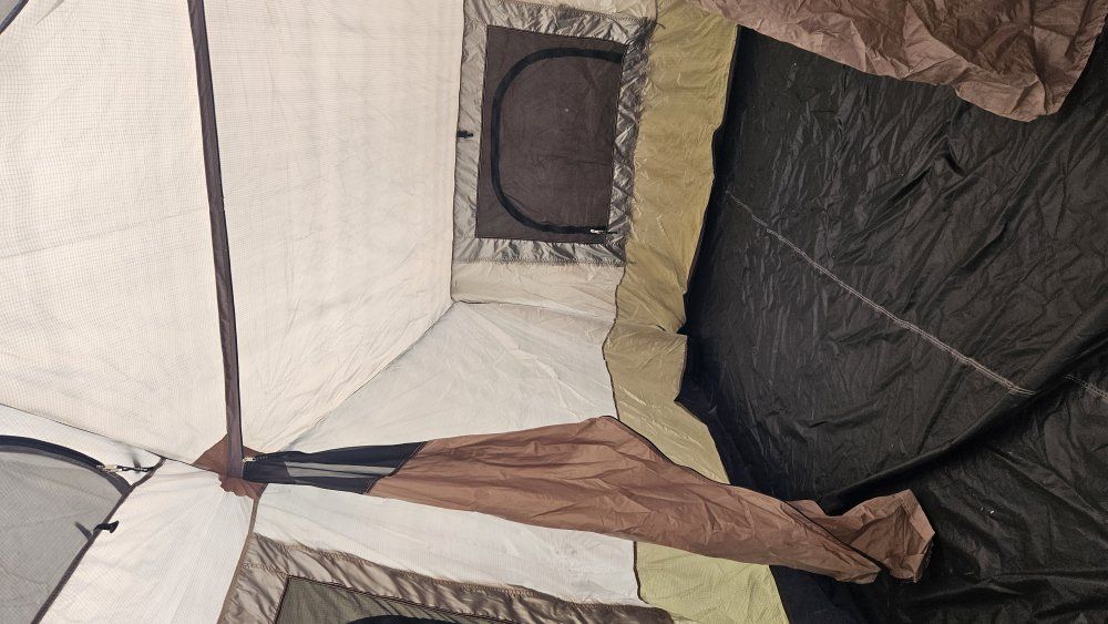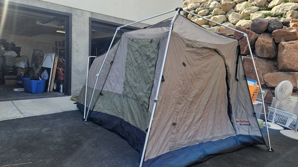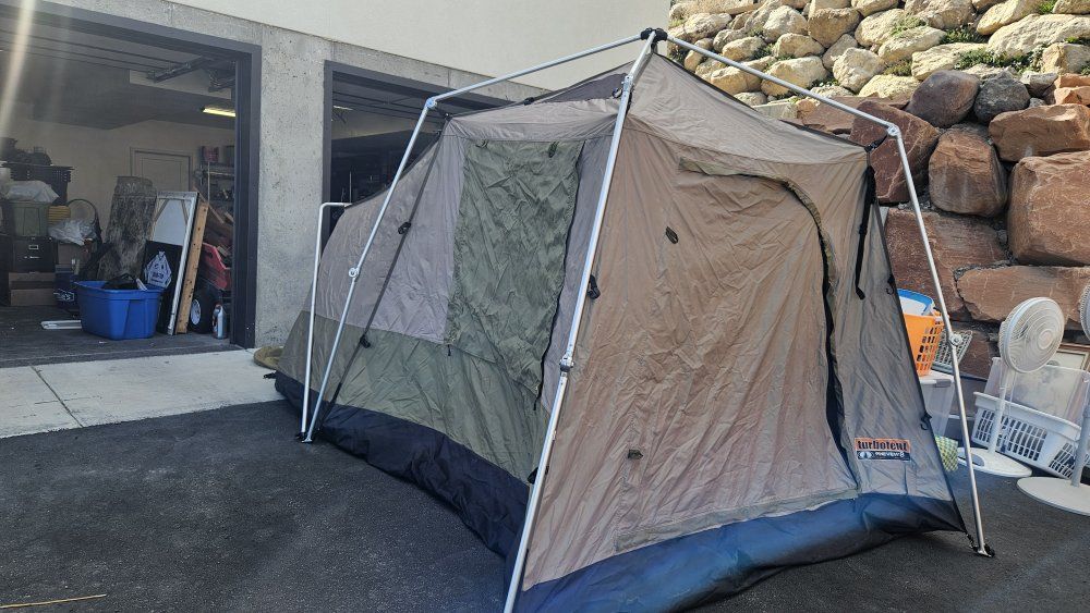 ZelleOBO. This tent goes up fast! TurboTent by Black Pine. 8 man tent, two room tent. excellent condition, light use, all zippers work great, full rain canopy with generous porch area covering over the door. this is a more durable fabric than your typical nylon tent. we purchased an upgraded bag for it to make it easier to carry.