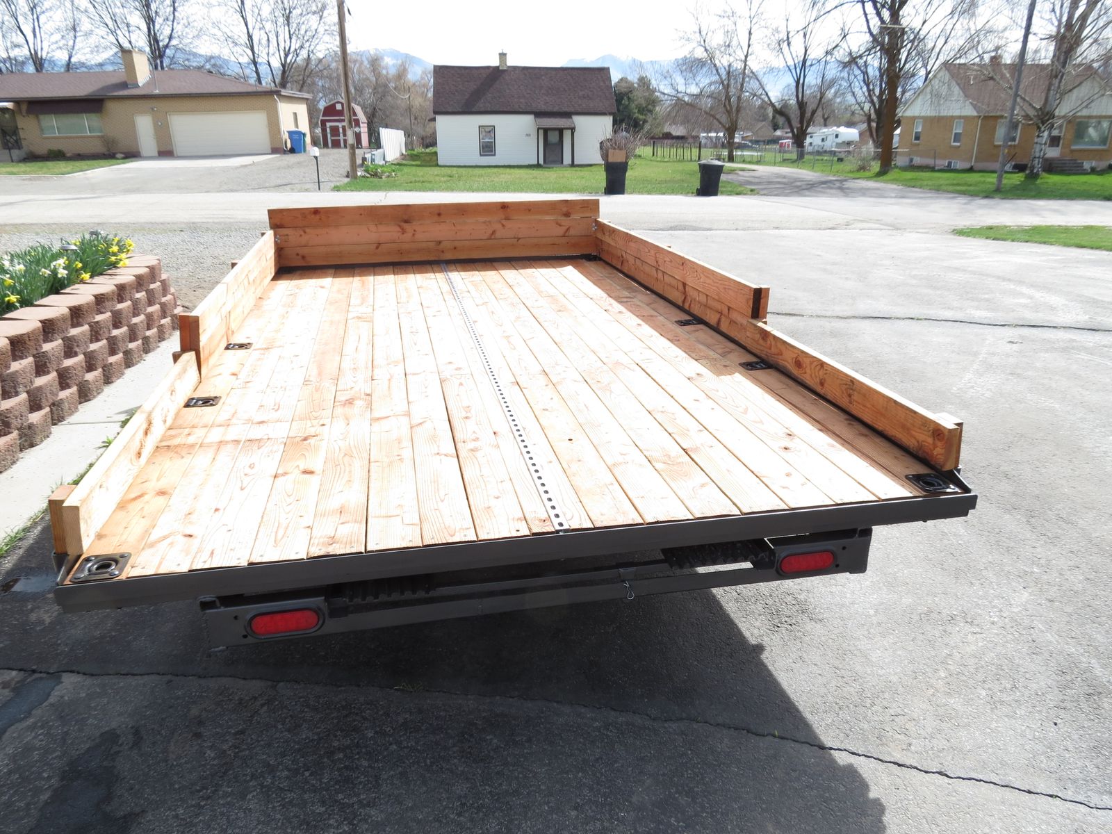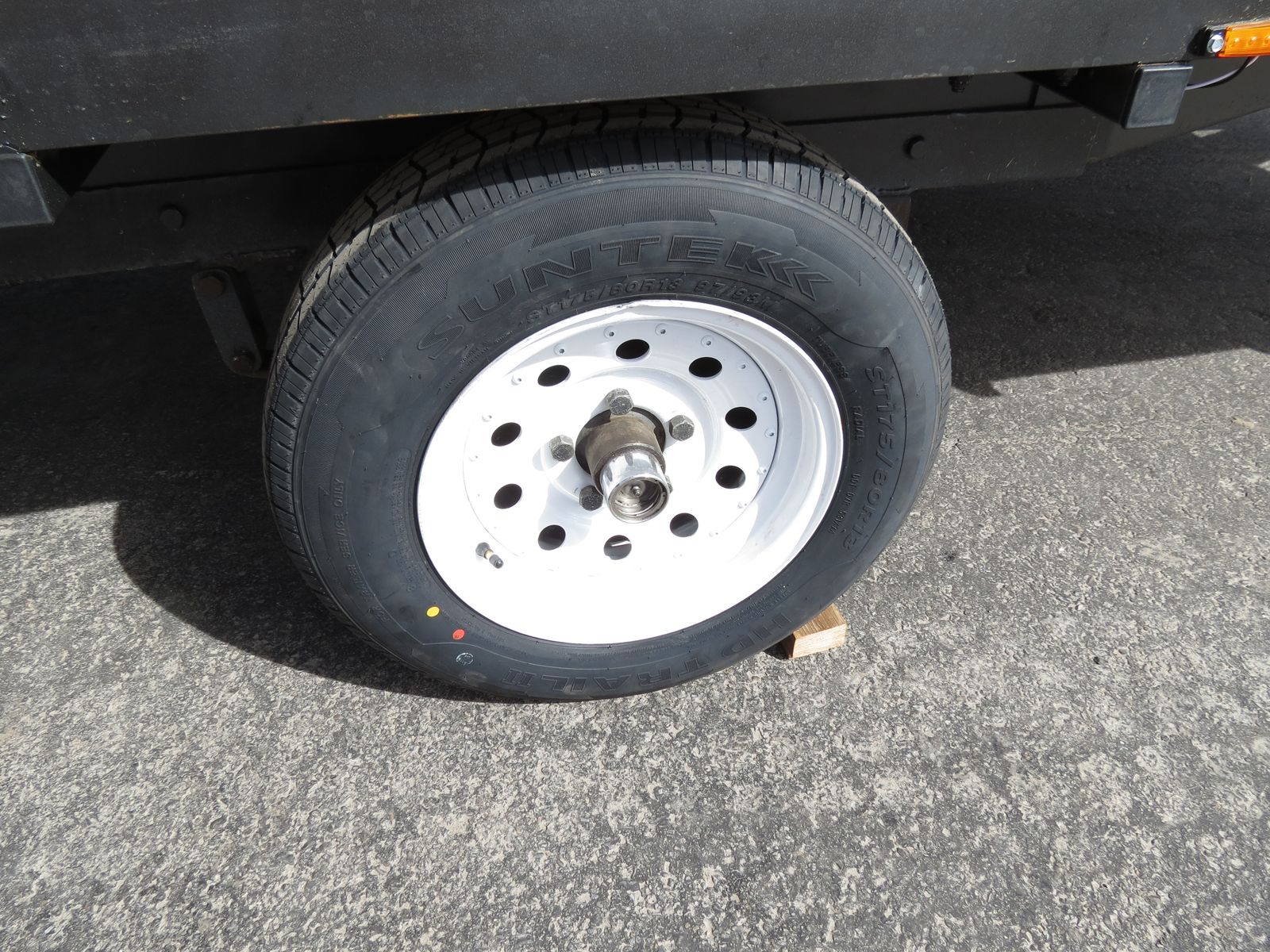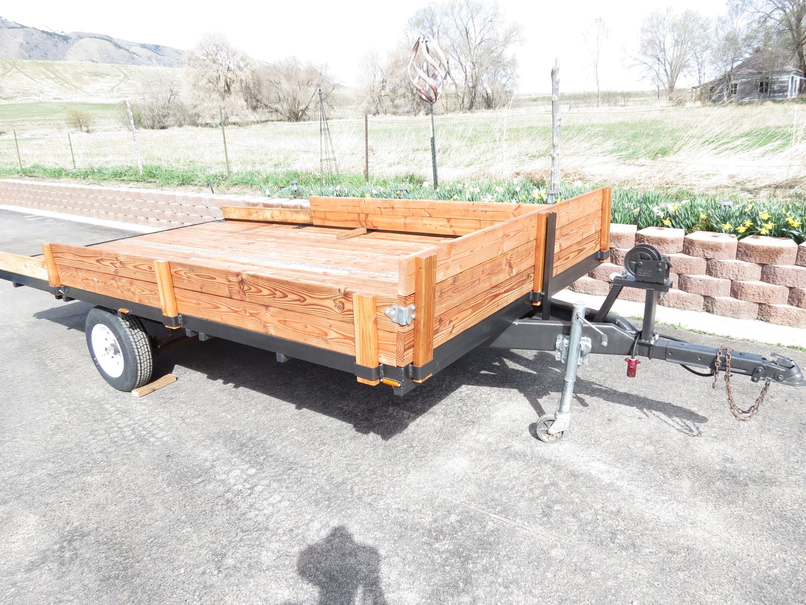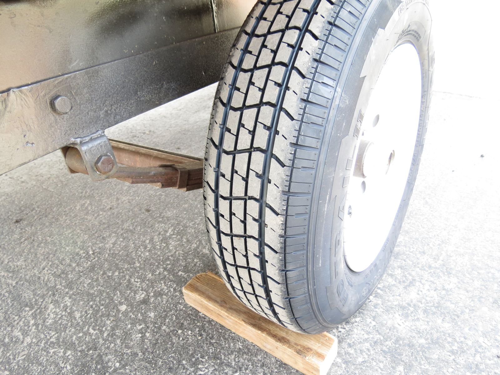 The 2X6 decking was treated with Thompsons Water Seal on all 4 sides and ends before being installed. There are heavy duty tie downs, secured to the frame, in all four corners and two more, secured to the frame, on each side. There is also a full length tie down bar in the middle of the trailer. The sides are easily removable. There is a ramp that slides into the back. The winch works very well. The wheel bearings are new, the tires are new and load range D. better than normal C. Their speed rating is M, which is 81 MPH. The wiring is all new and the connections have heat shrink around them for waterproofing.