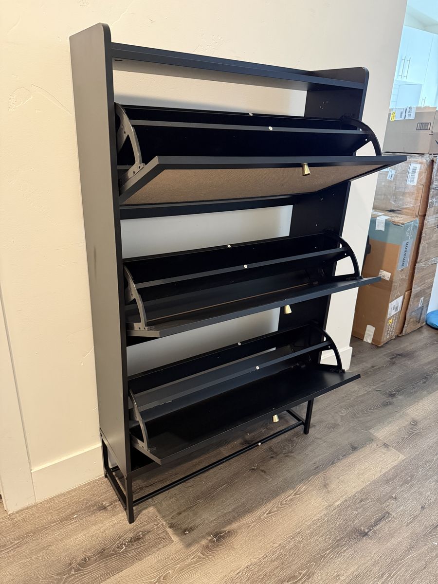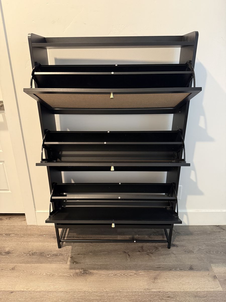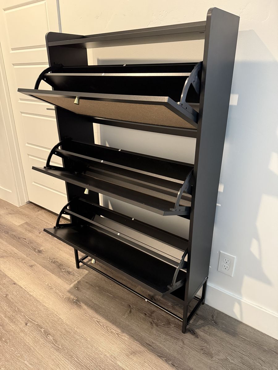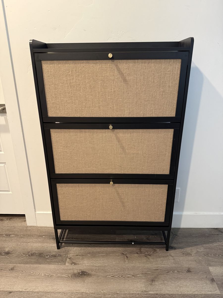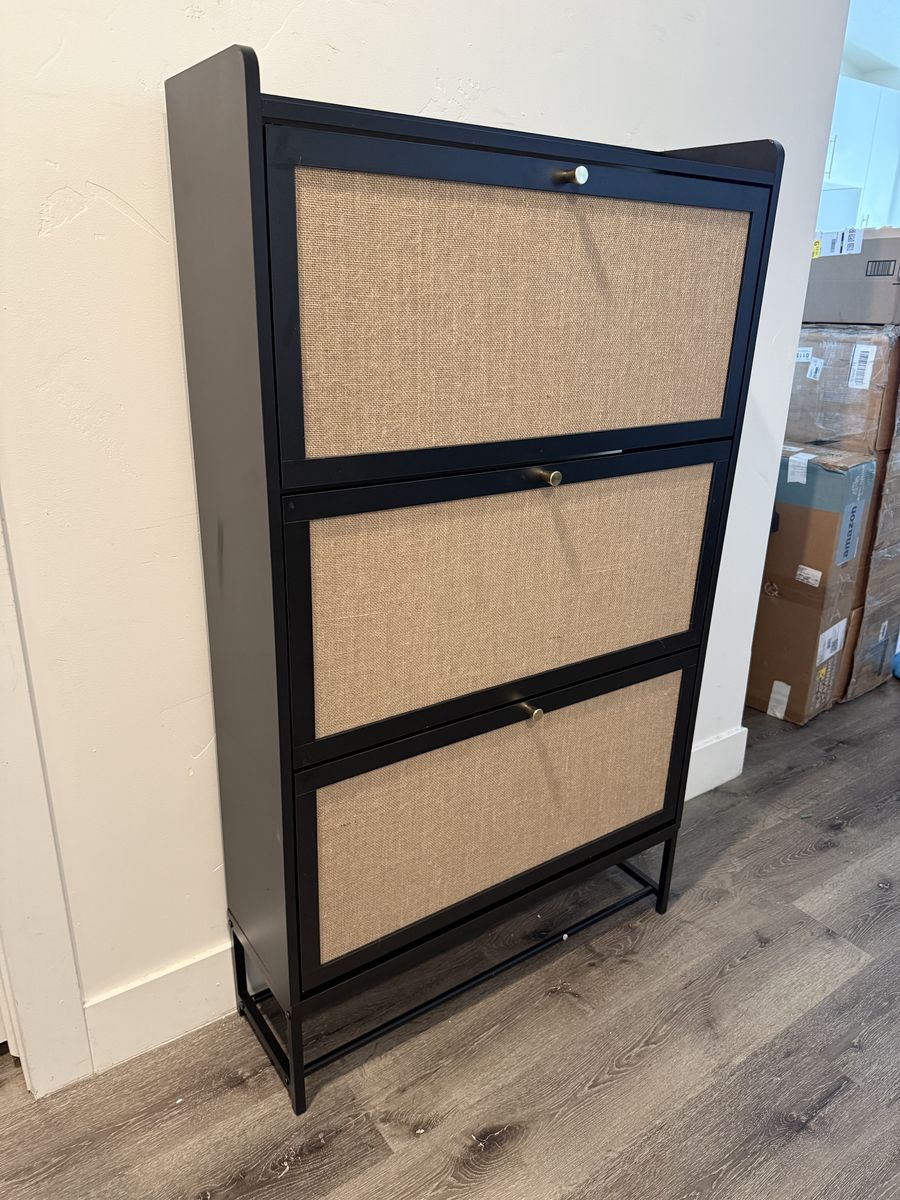 VenmoBrand New Modern Black Rattan 3 Drawer Shoe Storage Cabinet, Freestanding Wooden Shoe Rack with 3 Flip Drawers - Entryway Cabinet for Sneakers, Leather & High Heels - Black