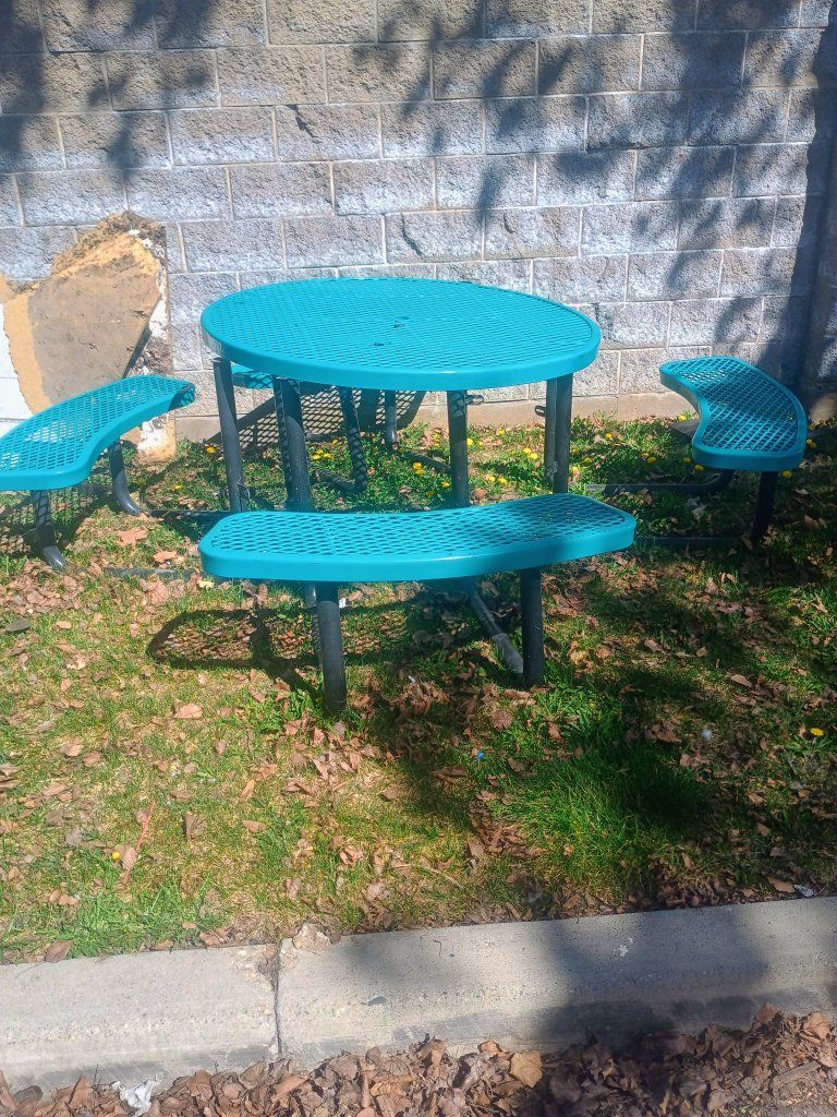 blue table with benches metal great for family barbeques ect. or just for your yard