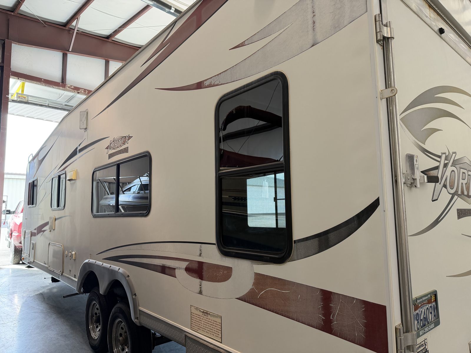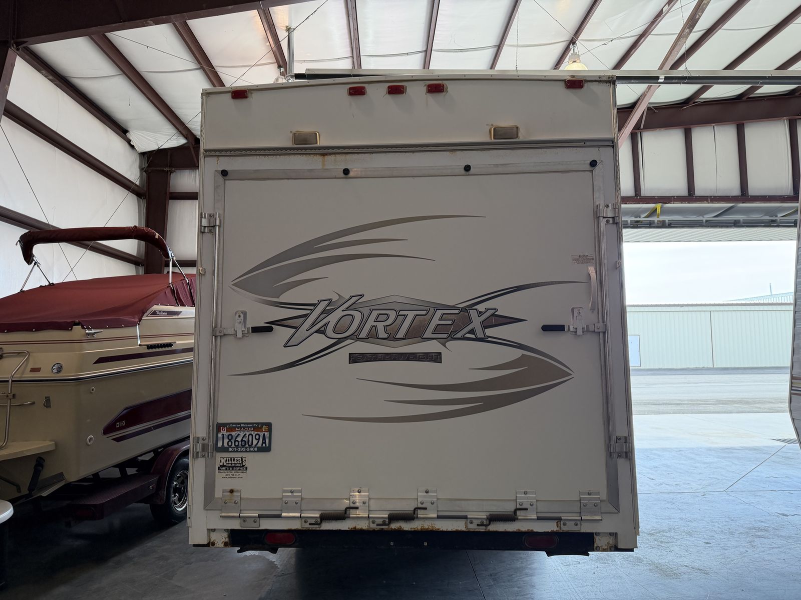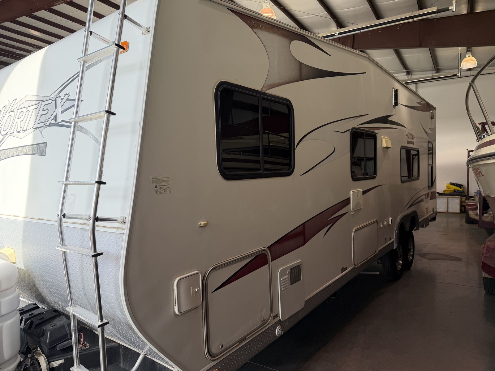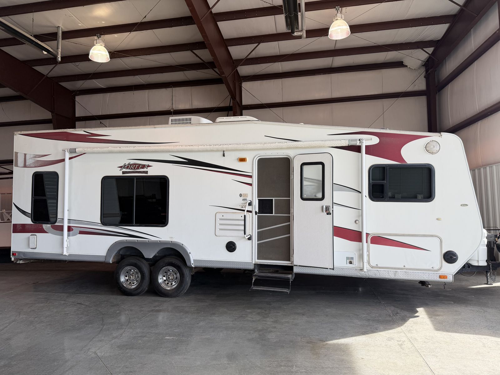 Vortex toy hauler camp trailer. Has brand new tires put on today. This is a great camp trailer, has 3 queen beds. 1 up front and a set of bunks in the rear. Has a Onan generator that works great! The inside is clean and very nice! Solar panel for batteries. No leaks.