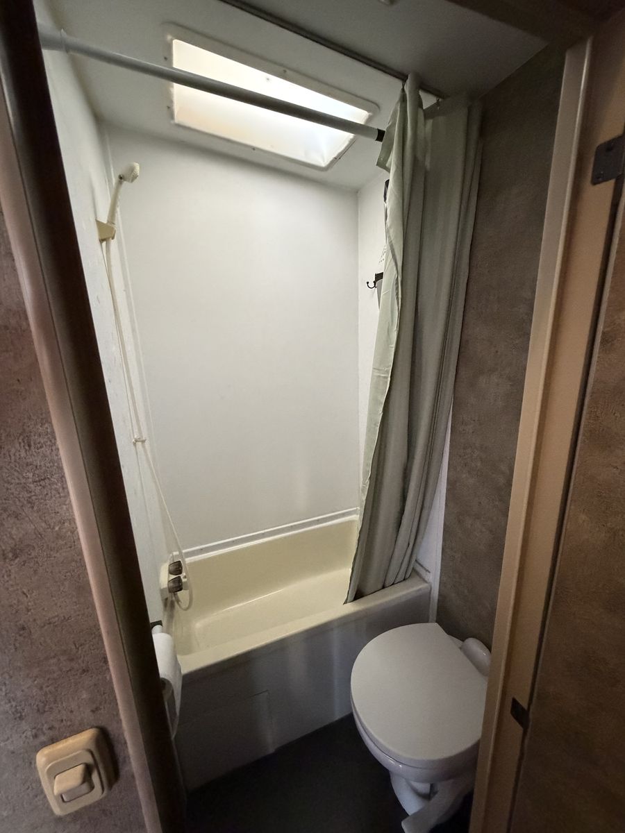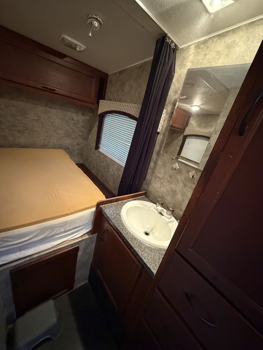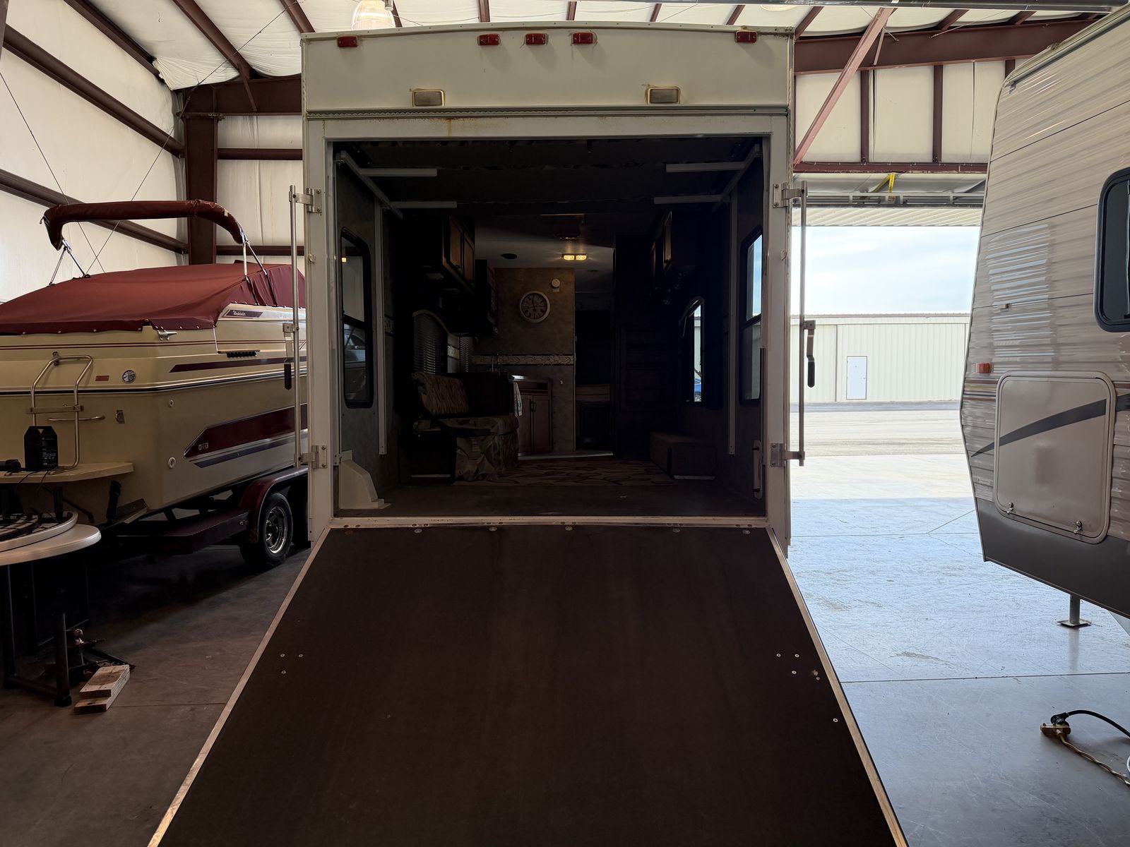 Vortex toy hauler camp trailer. Has brand new tires put on today. This is a great camp trailer, has 3 queen beds. 1 up front and a set of bunks in the rear. Has a Onan generator that works great! The inside is clean and very nice! Solar panel for batteries. No leaks.