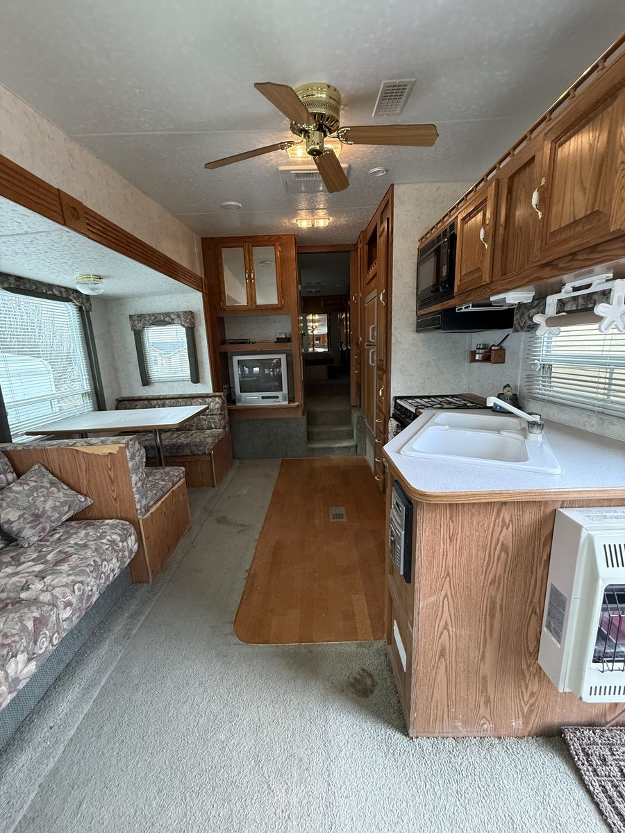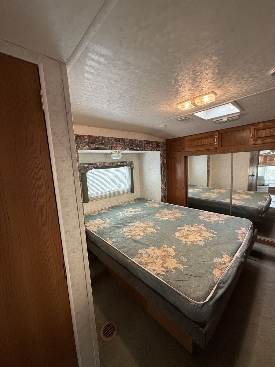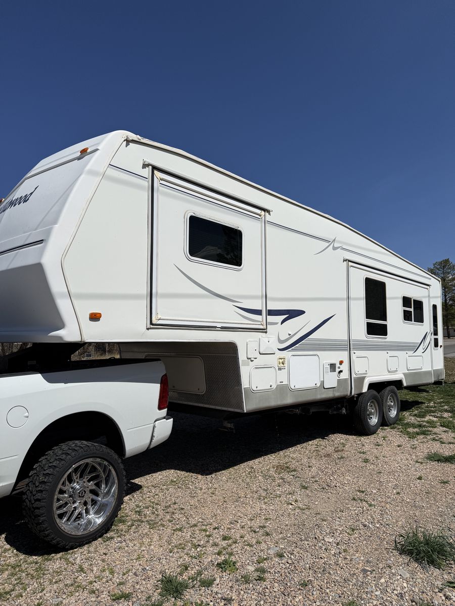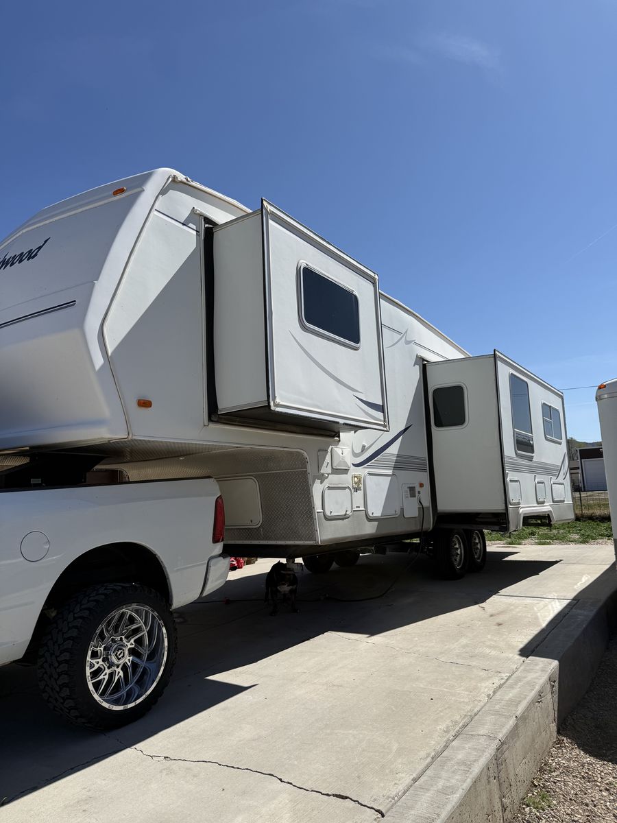 32' in length. Everything works, only minor issues (stained carpet, bent window blinds, broken A/C cover) it has new tires with less than 1 mile on them. Solar panel on roof, double slide outs, interior gas heater, tow hitch on rear of trailer, gooseneck adapter. It's been a great trailer, selling because I want a tongue pull camp trailer so I can take my dirtbike with me. Asking $10k obo