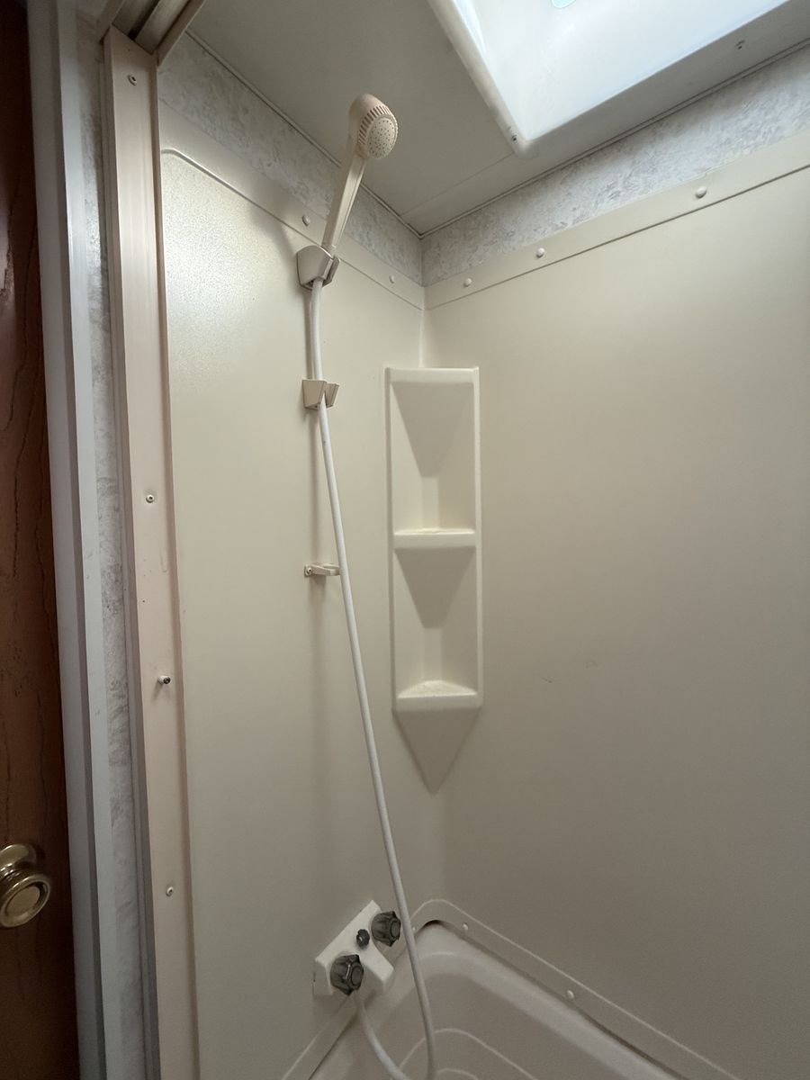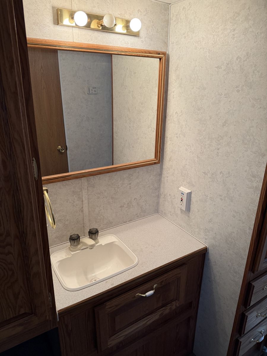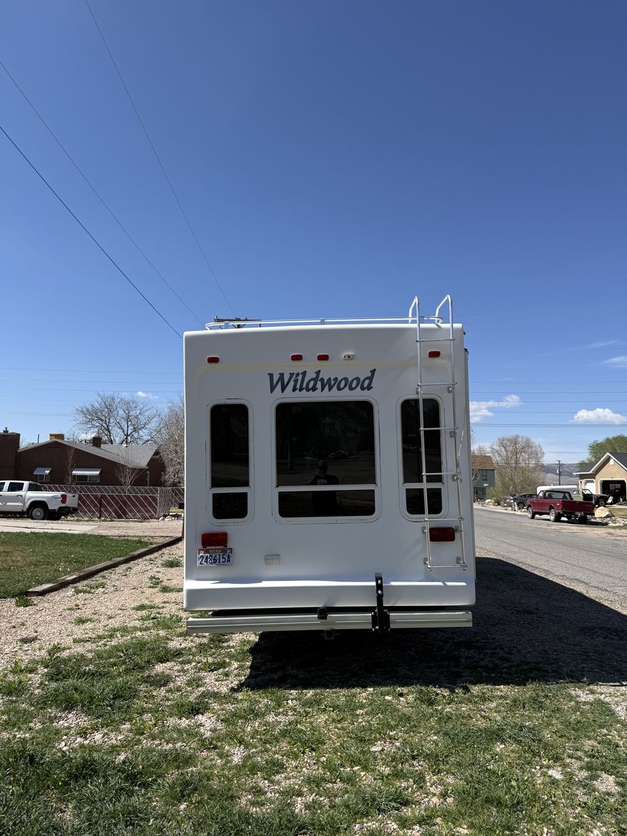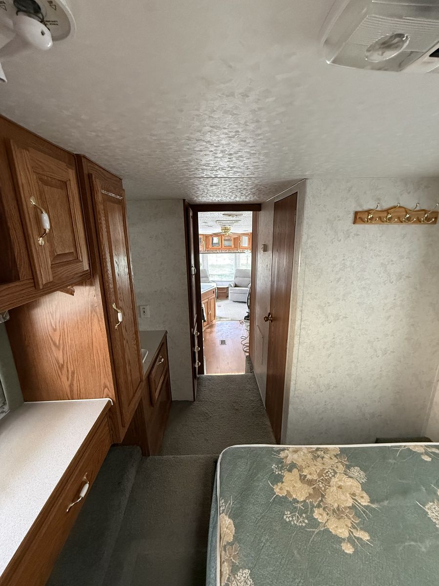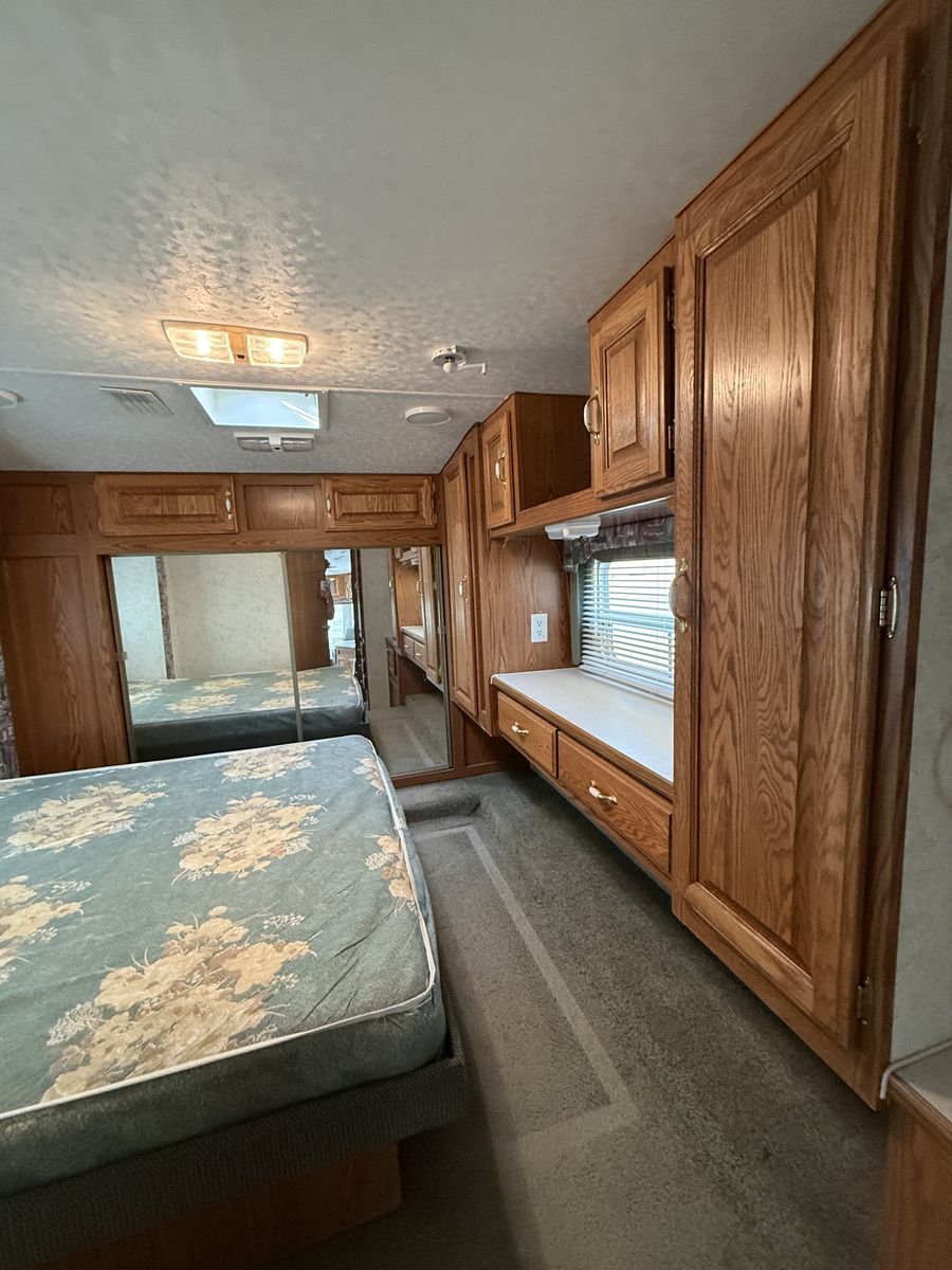 32' in length. Everything works, only minor issues (stained carpet, bent window blinds, broken A/C cover) it has new tires with less than 1 mile on them. Solar panel on roof, double slide outs, interior gas heater, tow hitch on rear of trailer, gooseneck adapter. It's been a great trailer, selling because I want a tongue pull camp trailer so I can take my dirtbike with me. Asking $10k obo