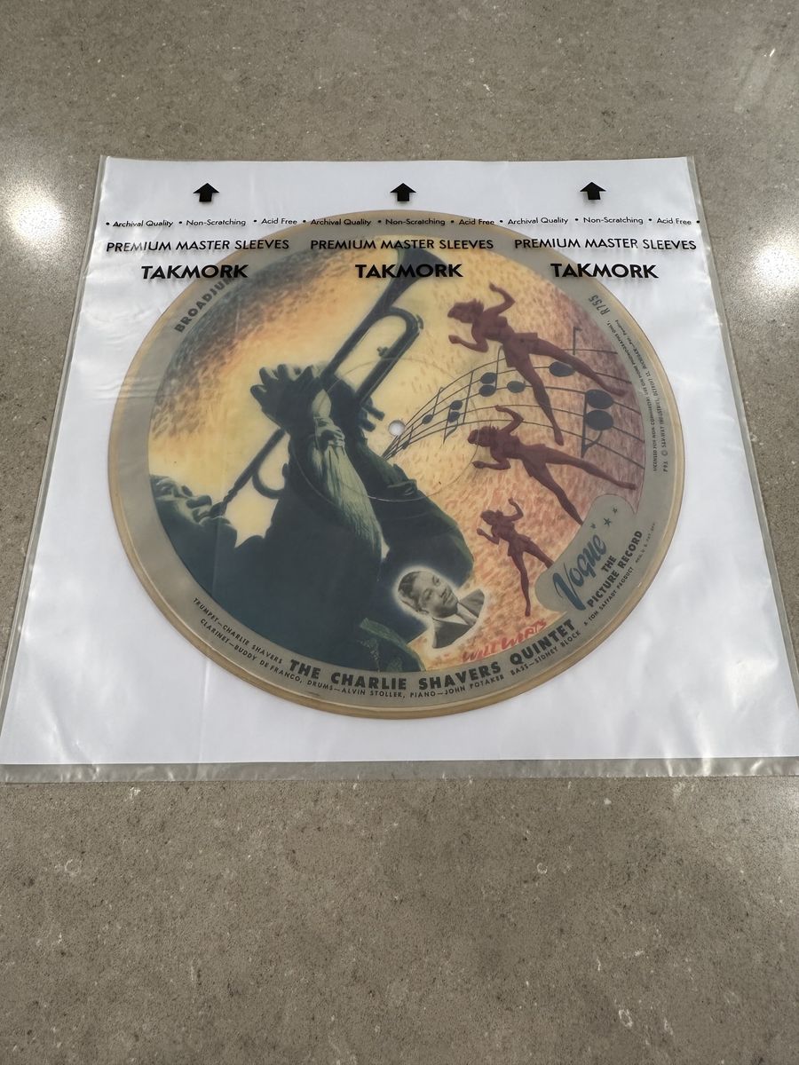 This is a rare Vogue Picture Record, specifically a 10-inch, 78 RPM record from 1946 featuring The Charlie Shavers Quintet performing the song "Broadjump” and on the other side “Serenade To A Pair Of Nylons,” manufactured in 1946 by Sav-Way Industries in Detroit, Michigan. It is used and has scratches and wear from age and use. It didn’t come in a sleeve so I put it in a rice paper inner sleeve and then a blank cardboard sleeve to keep it protected and so it will remain in this condition until it is sent to you. There are pictures of both. There are a good amount of scratches from age and use. It plays really pretty well though. There is a lot of static and pops but I was surprised at how well it played. Because of its rarity and its age it is a really cool collectors item and pretty valuable.