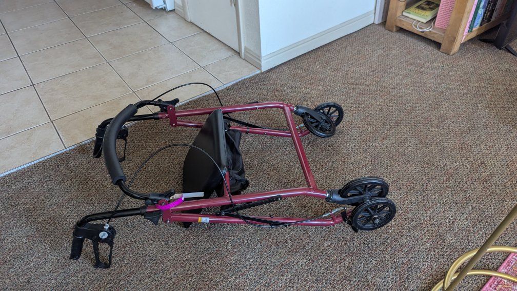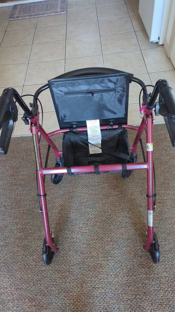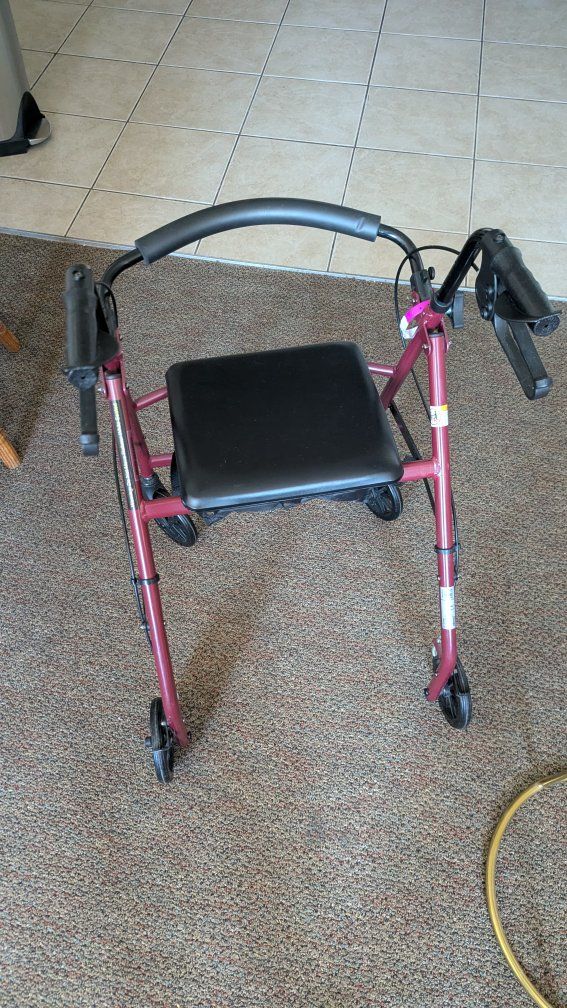 Selling a Rollator - Walking aid for someone who needs it . This was only used for a short time so practically new. This folds up nicely so you can transport it easy . Storage underneath the seated area. Breaks are easy to use and the height is adjustable! Nice seat cushion for a break. or OBO