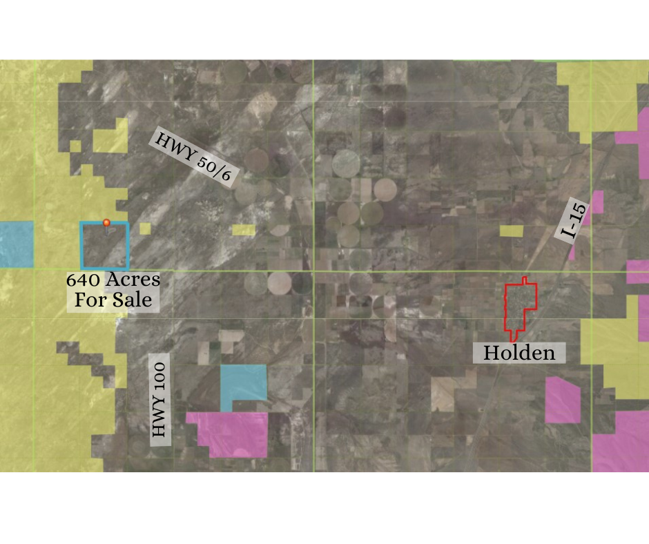 ***This property is for sale through Signature Real Estate. Contact Lucas Stevens at 435-253-1138 or Molly Stevens at 435-864-8398 for more information.*** Here's a wonderful opportunity to own a FULL section of land: 1 Mile x 1 Mile, 640 acres! This property is located 1 mile west of Hwy 100 and 8 miles west of Holden on the west side of I-15 in central Utah. Historically used as range ground. It borders the BLM public lands. Are you into hunting? This parcel fits the acreage requirement for "General Season Landowner Permits". This would also make an amazing recreational retreat near the Sugarloaf volcano (Pahvant Butte), miles of ATV trails in the mountains and the desert and portions of the property have sand bars. You can see for miles in all directions and your night skies are not polluted by light. Great area for stargazing. Maps & address are approximate. No deeded access to the property, owners have accessed the land from the adjacent BLM land. The yellow on the map is BLM ground. Any/all mineral rights are included.