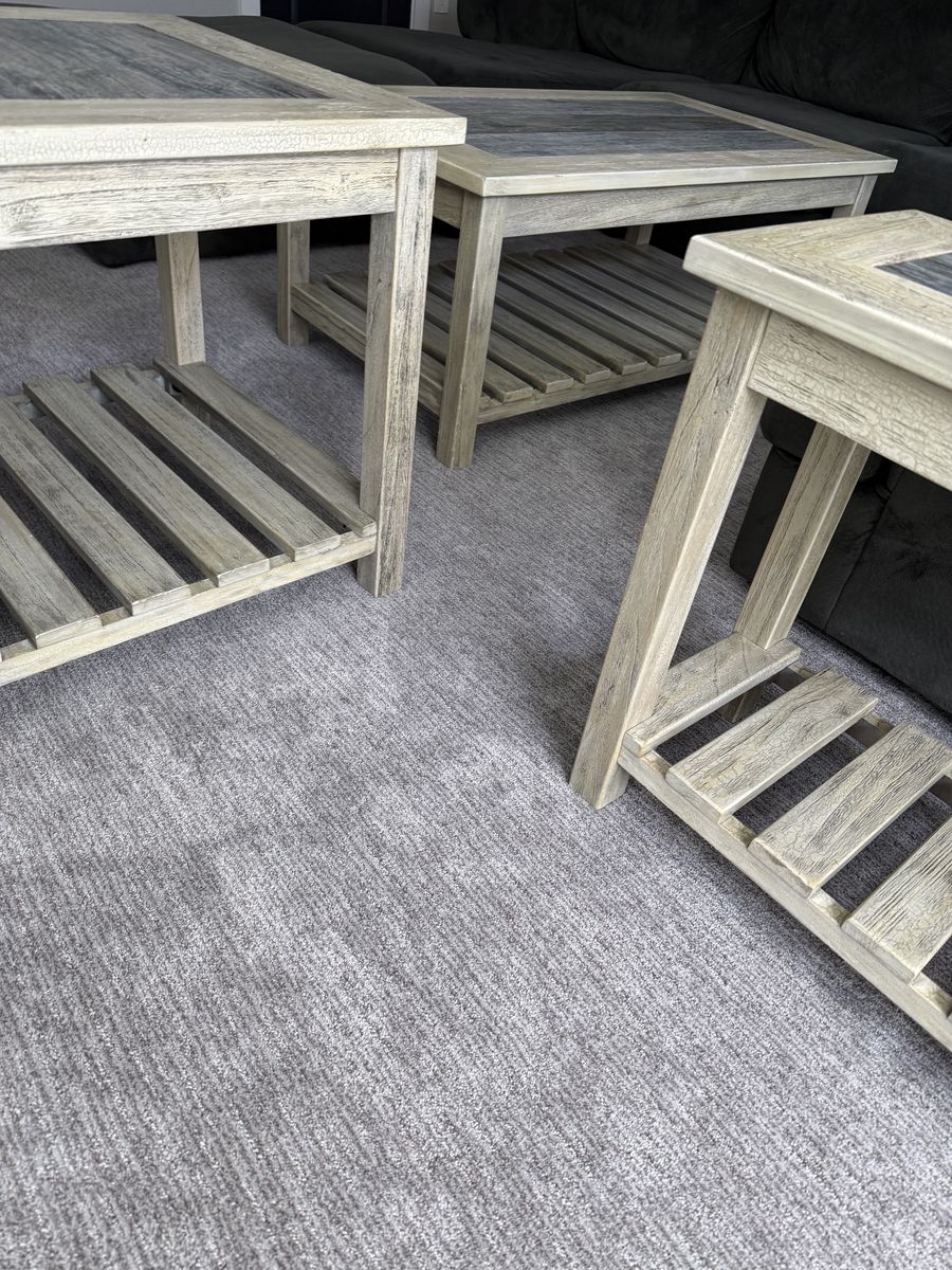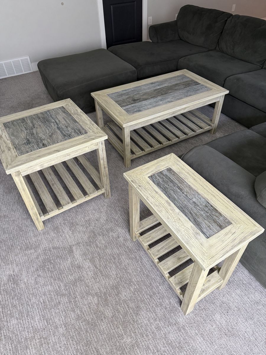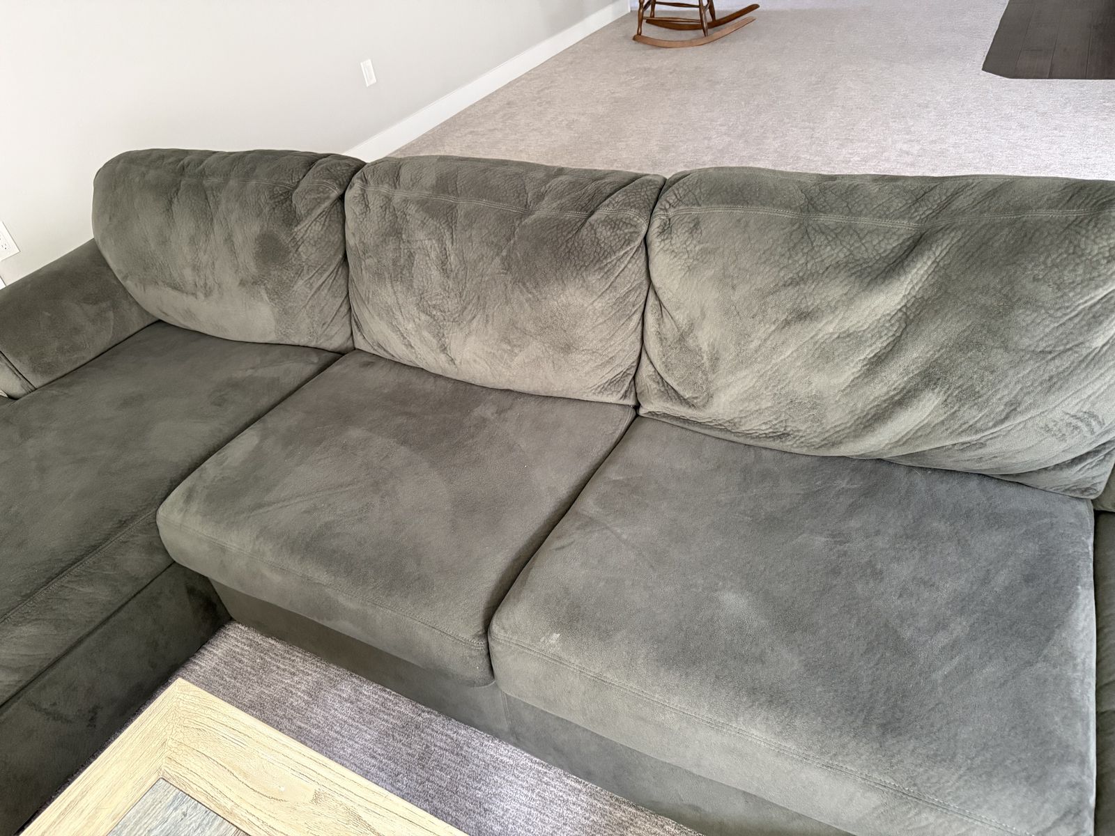 Venmo4 piece sectional sofa and three tables for sale. Sofa is pewter, in good shape. No smoking, sofa is clean. tables also in good condition. Dimensions: 32" high, 39" deep, couch is 91 " long, Chase lounge is 62" long, ottoman is 40x38".