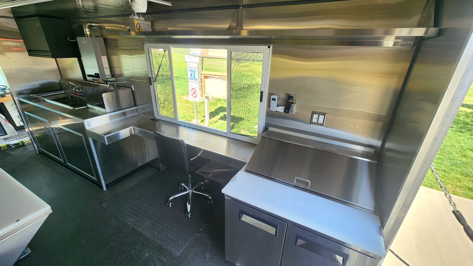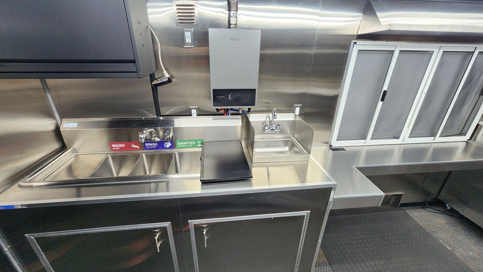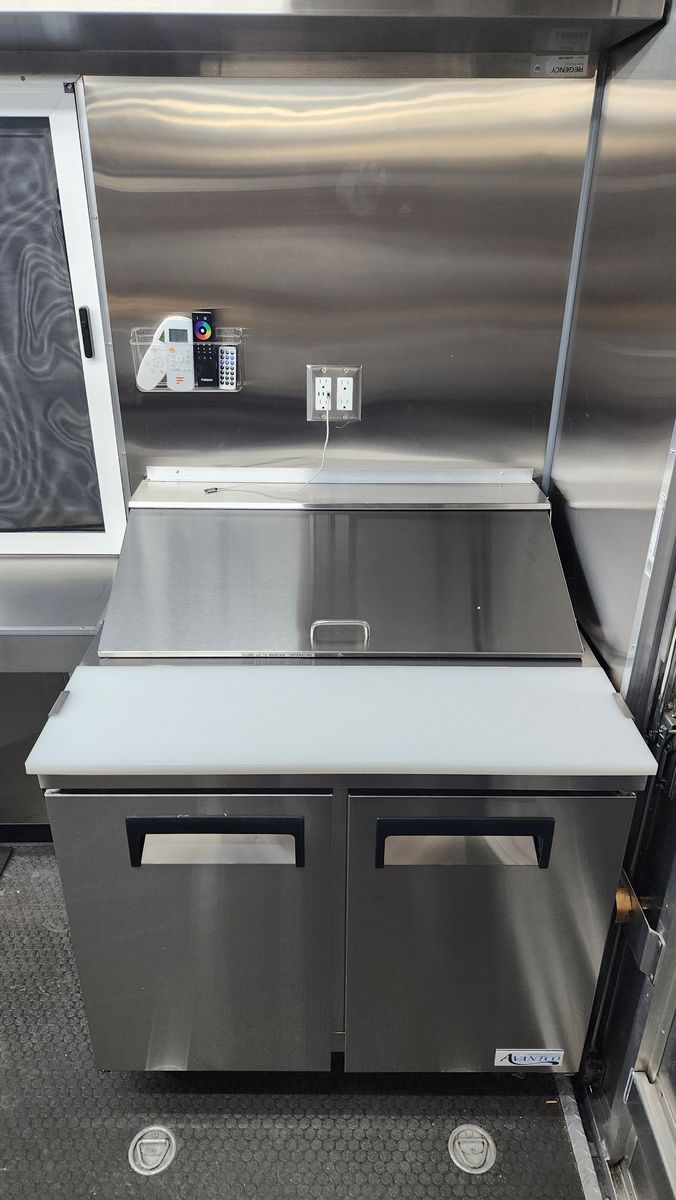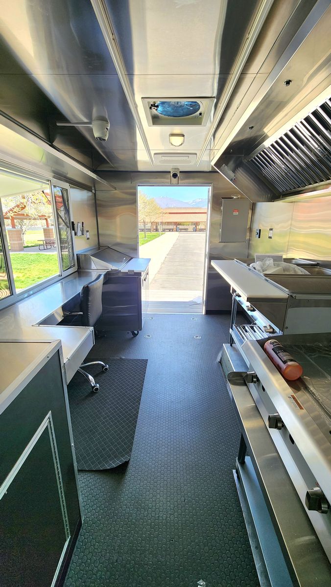 • Always-on rear-view camera with 7" monitor • Hard-wired Type-S dash cam with 128GB storage • 6-camera Lorex 4K hard-wired surveillance system with 27" monitor (remote access) • Commercial metal cabinet for electronics and monitoring equipment • Exterior LED lighting on all sides of the truck and both sides of the service window • 55" exterior digital menu display • (2) Fusion marine-grade outdoor speakers with LED lighting oaired with a sound amplifier to call out orders • Undercarriage jellyfish-style LED lighting – perfect for night events • Rain-sensing ventilation fan • 60" × 36" service window with sliding screen doors