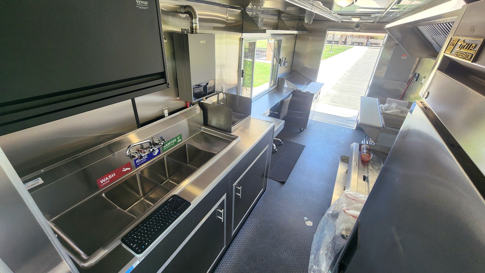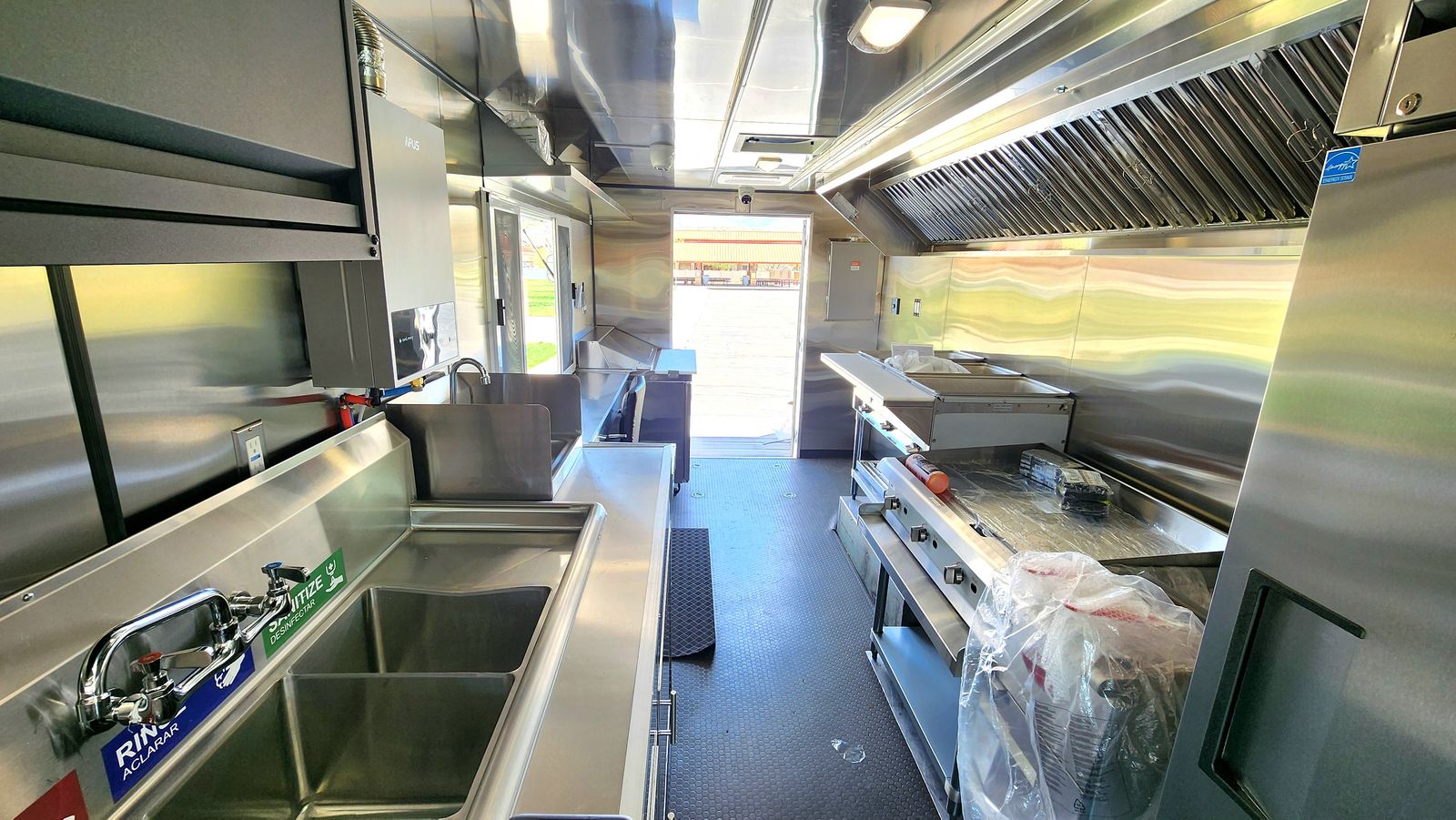 • All kitchen surfaces are 20-gauge stainless steel • R32 insulation throughout the truck • Raised coin rubber flooring with 4" rubber baseboard • 44" wide rear door • 7 ft × 6 ft removable left gate – ideal for BBQ equipment & event services