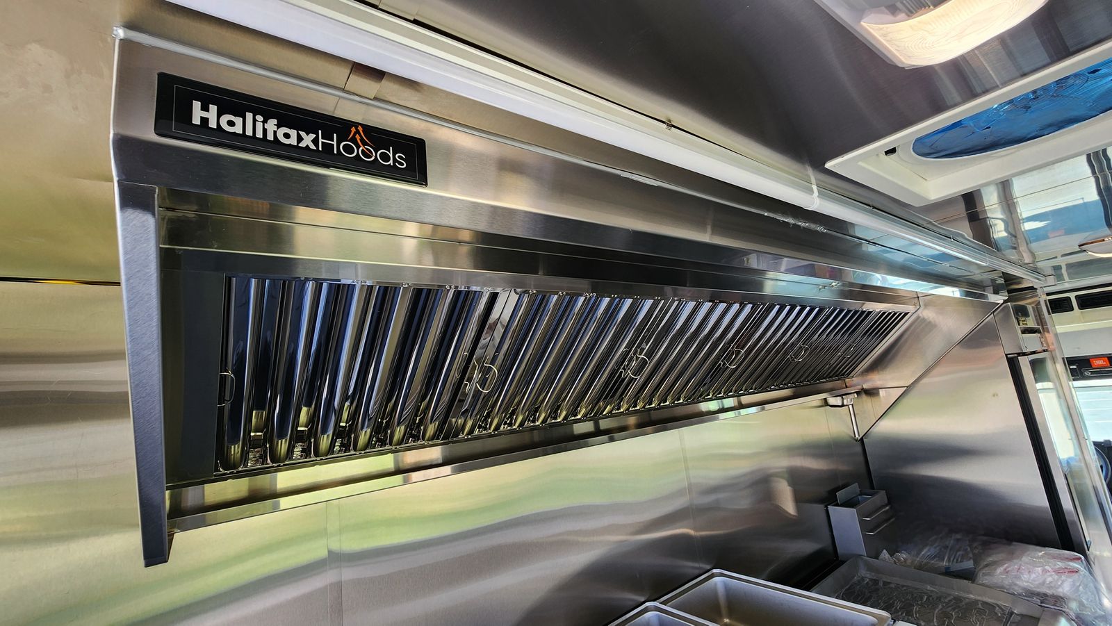 • 10 ft Halifax commercial hood, 2,000 CFM exhaust fan with variable speed control • 40 lb propane fryer • 36" flat-top griddle • 3 well full-size propane steam table • 36" sandwich prep table • 27" tall TRUE commercial standing refrigerator