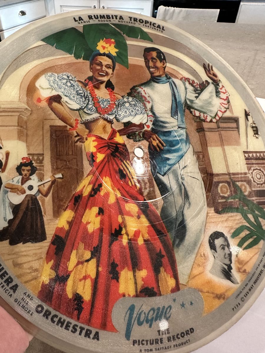 This is a rare Vogue Picture Record, specifically catalog number R777, which features the song "Tiqui Tiqui Tan" on one side and “La Rumbita Tropical” on the other, both performed by Enric Madriguera and His Orchestra with vocals by Patricia Gilmore. It is used and has scratches and wear from age and use on both sides. On the “La Rumbita Tropical” side, it has a few deeper scratches that are pictured so you can see what you’re getting. I played it and even with the deeper scratches it is able to play pretty well. There is a good amount of static and pops but I was surprised at how well it played even with those big scratches. The other side plays similarly. It didn’t come in a sleeve so I put it in a rice paper inner sleeve and then a blank cardboard sleeve to keep it protected and so it will remain in this condition until it is sent to you. There are pictures of both. Because of its rarity and its age it is a really cool collectors item and pretty valuable.