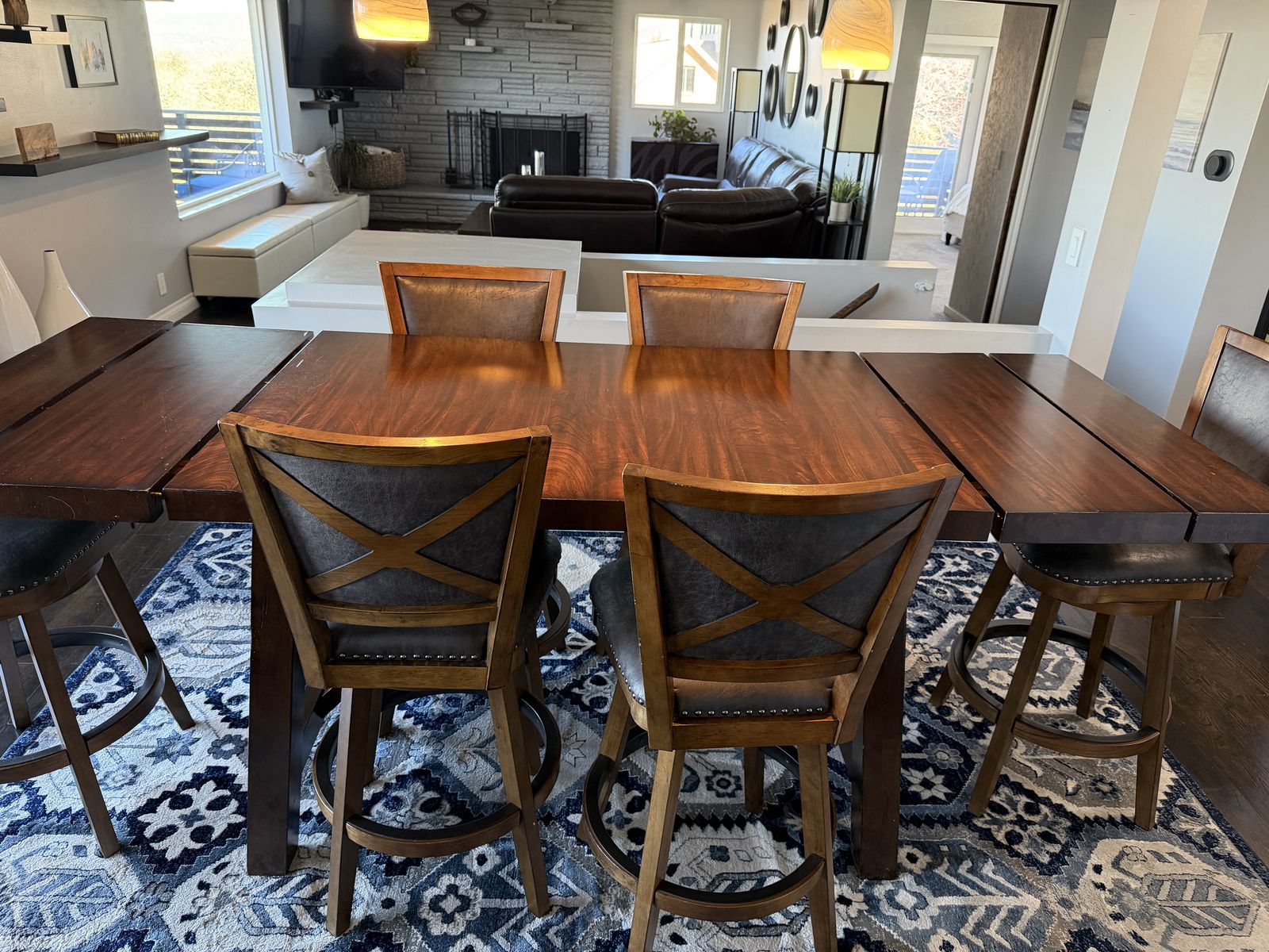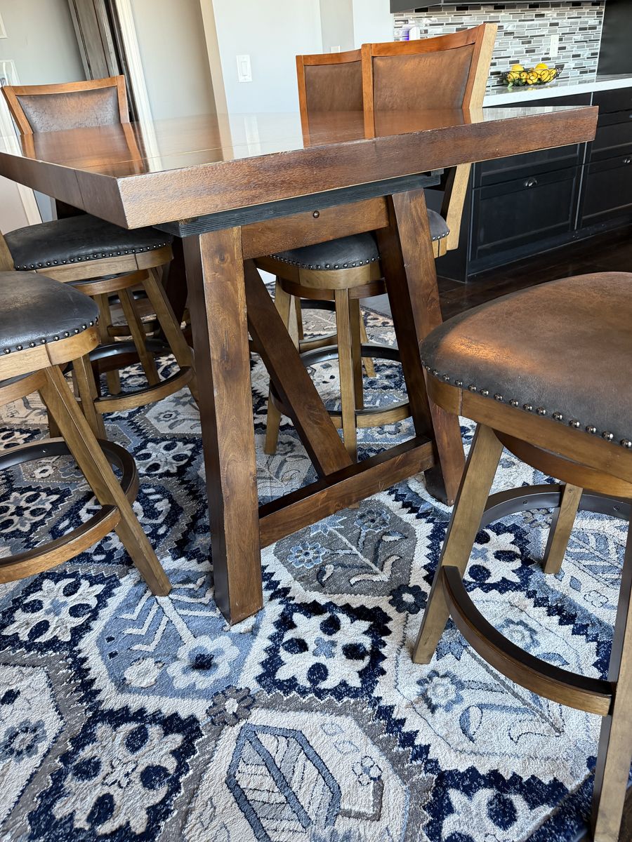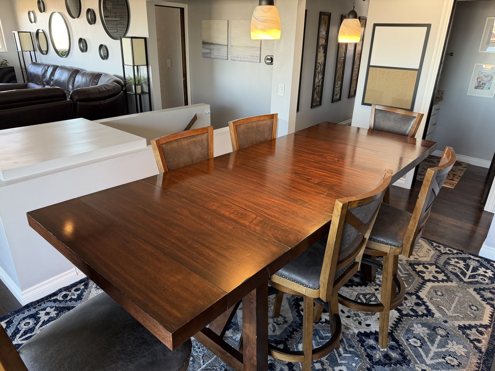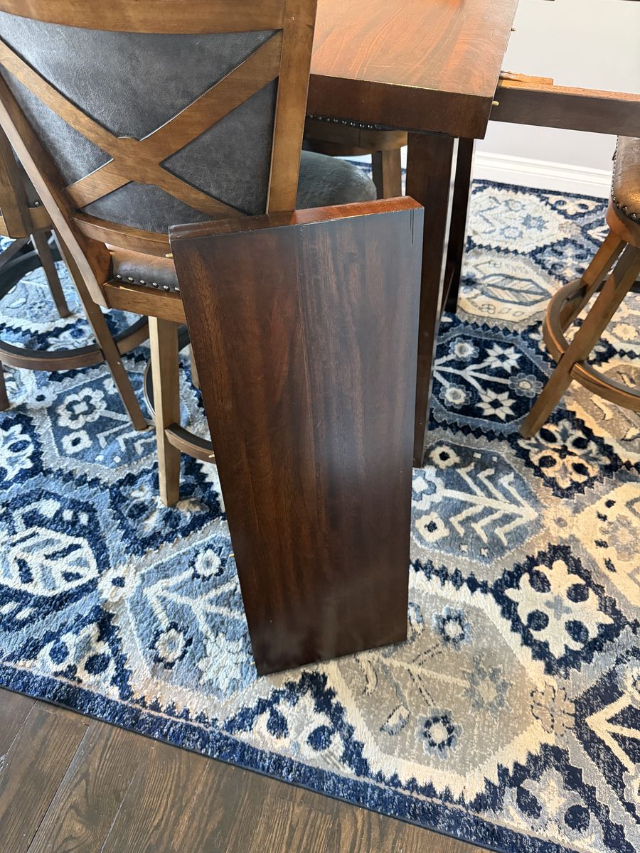 VenmoExtremely well-made hardwood table measures 70 inches long without leaves and 96 inches long with leaves. It is 36 inches wide and 38 inches tall comes with six leather and hardwood stools.