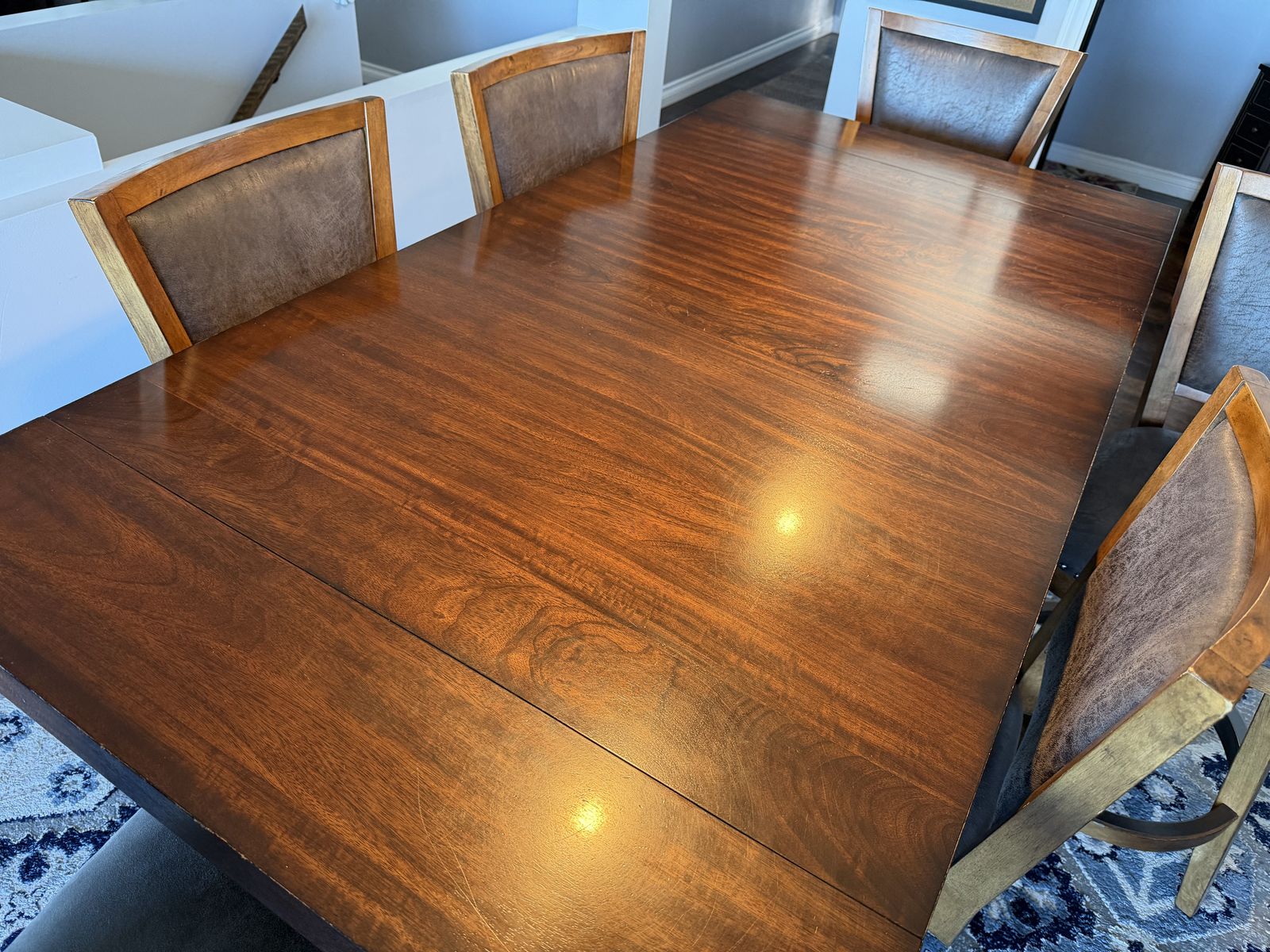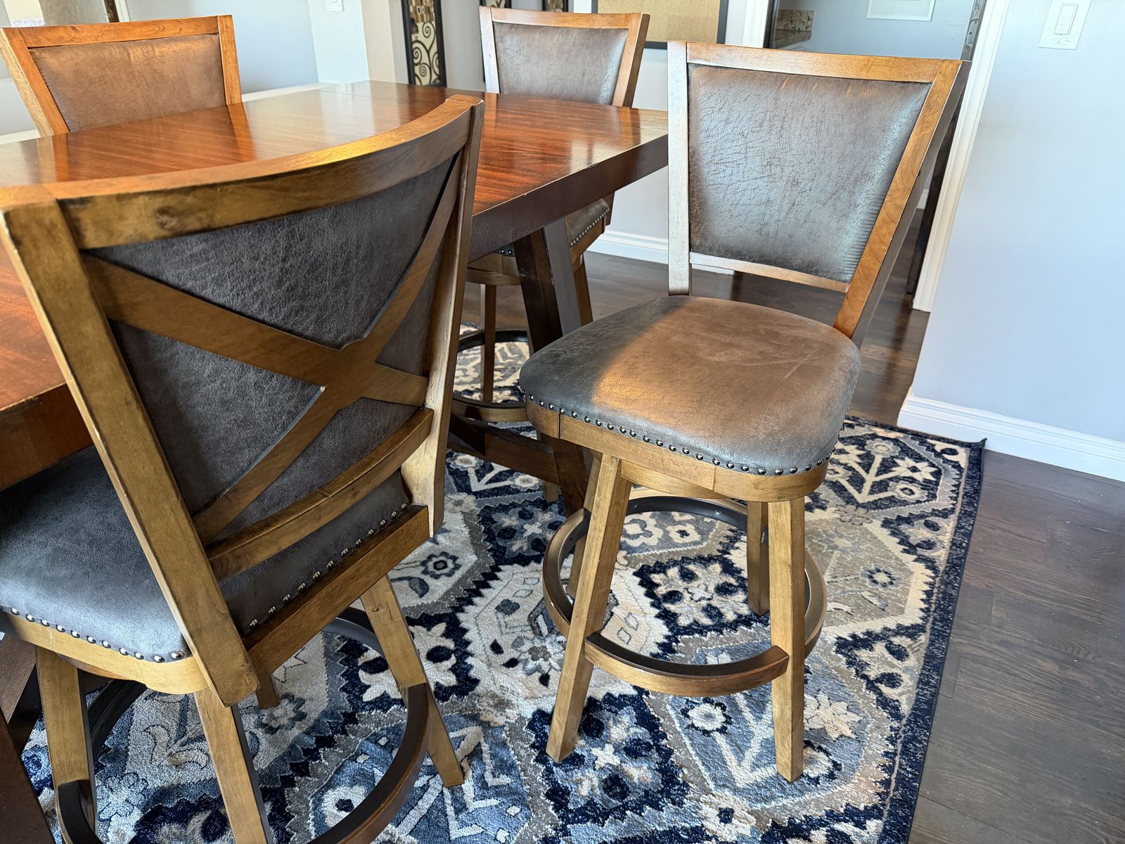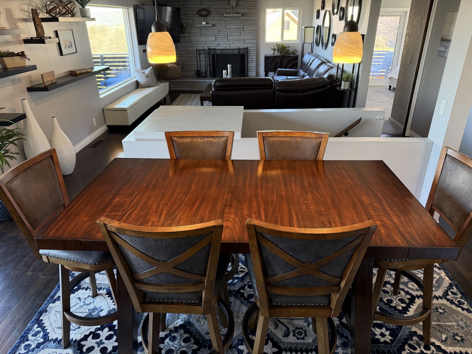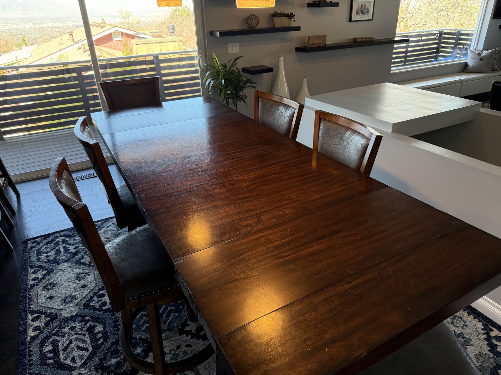 VenmoExtremely well-made hardwood table measures 70 inches long without leaves and 96 inches long with leaves. It is 36 inches wide and 38 inches tall comes with six leather and hardwood stools.