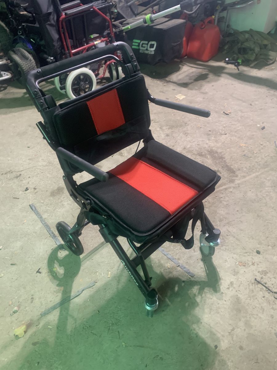 Wheelchair that is easy transportation this foldable chair is great for if you don’t want to pull a trailer it can just fit in the back of your truck or back of your car this is my grandpas and he decided that it won’t work for him