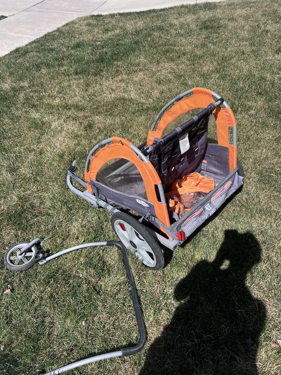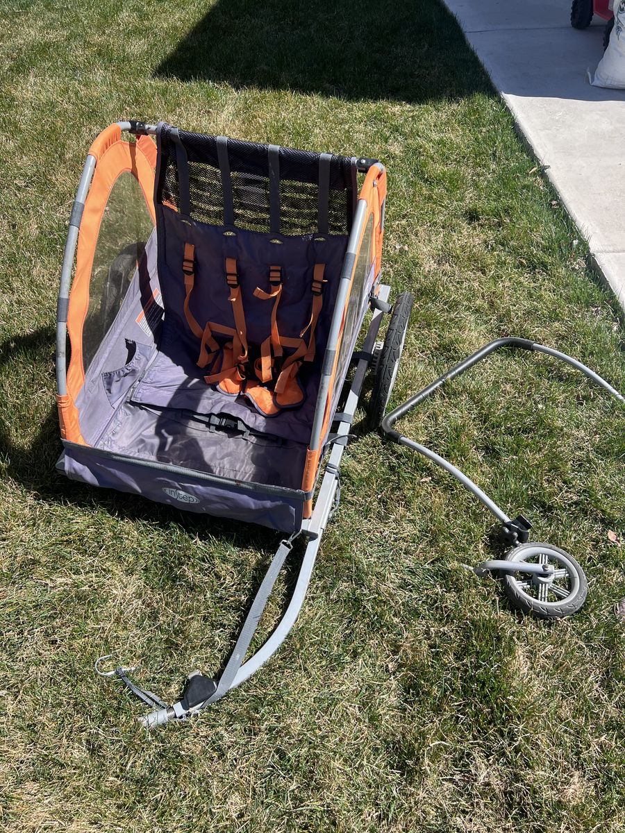 ApplePayBike trailer with stroller attachment. Has rain fly and bike attachment. Set of 3 seatbelts across the back. Has always been folded up and stored inside. I’m truly sad to be selling this, all of my kids ride their own bikes now