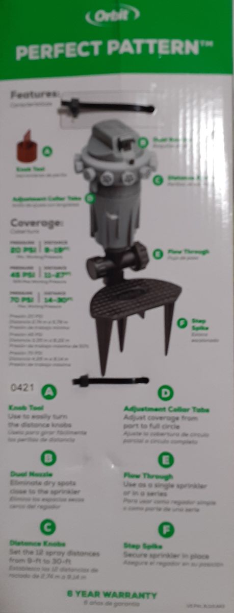 This New Orbit Shaped Pattern Precision Arc Rotating Spike Lawn/Garden Sprinkler with 12-Adjustable Collar Knobs, Dual Nozzle And Water Flow Through Is Still Originally Packed.