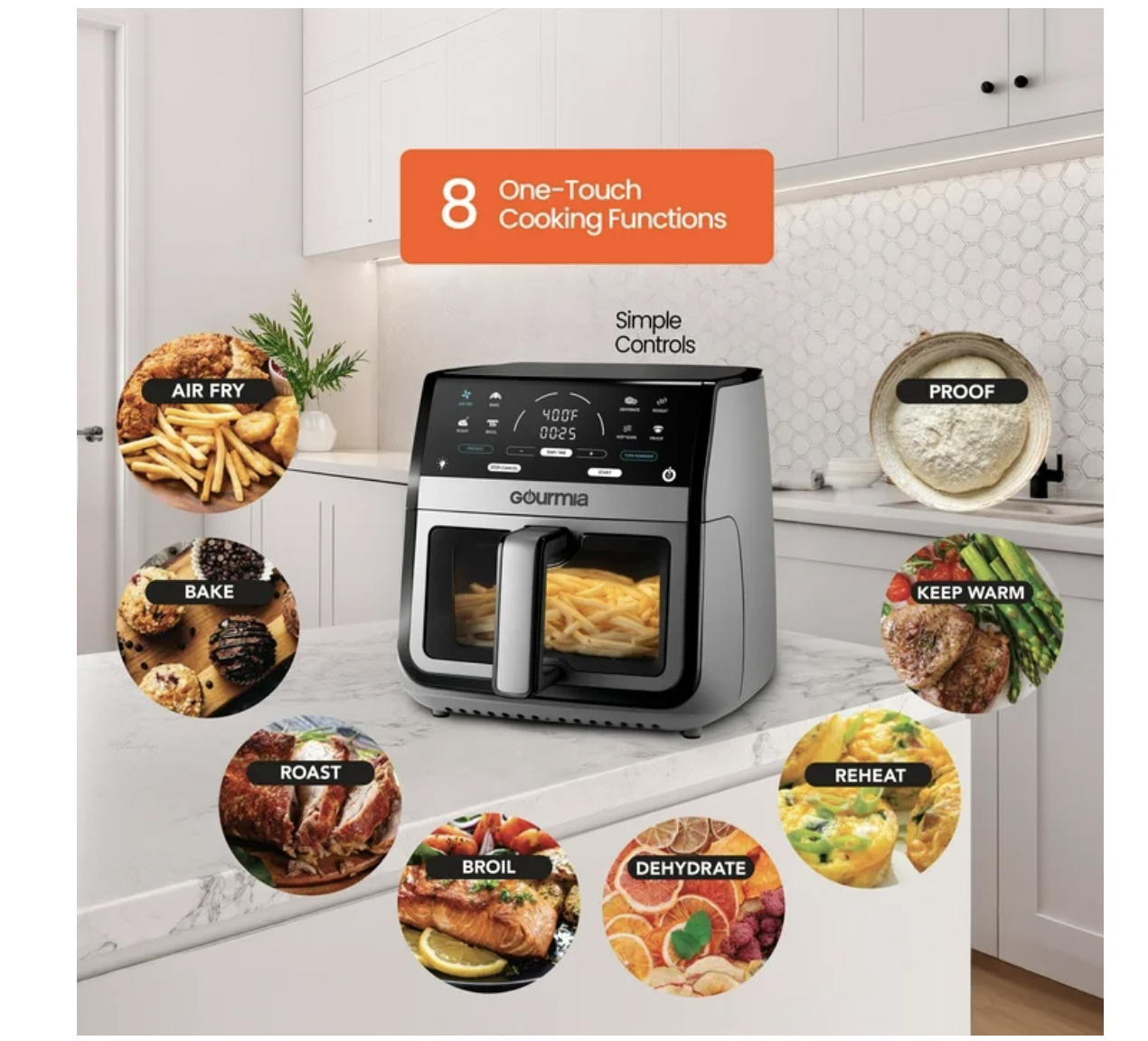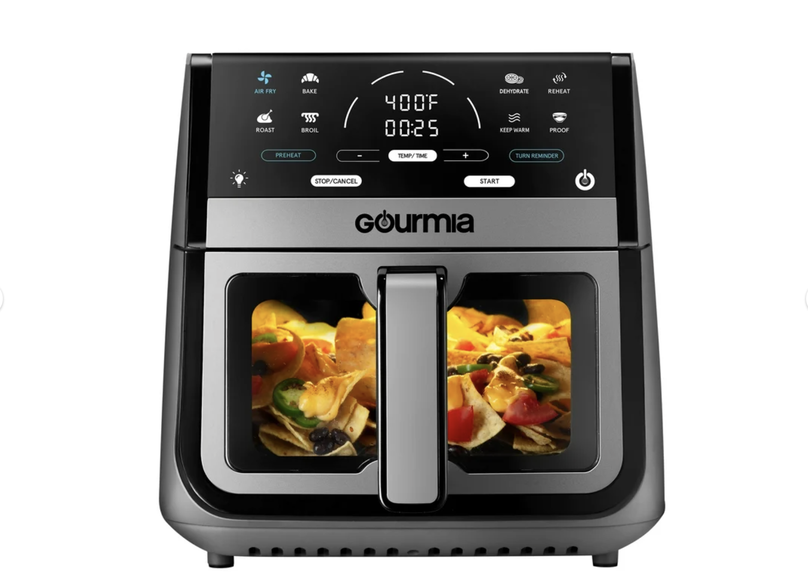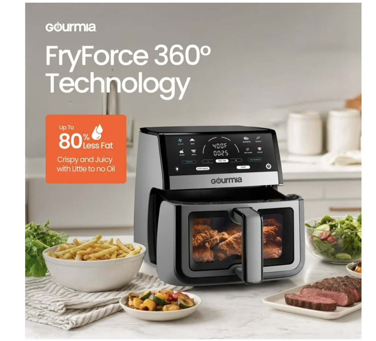 Brand new in box, Gourmia 8 Qt Digital Window Air Fryer with 8 One-Touch Cooking Functions, Extra-large 8-QT capacity cooks for 6-8 people Multiple dishes are one tap away with 8 One-Touch Cooking Functions FryForce 360° Technology™ fries with air for up to 80% less fat Window and light let you monitor food at-a-glance An optional Preheat and Turn Food Reminder achieve delicious results Guided Cooking Prompts offer helpful display messages and alerts Dishwasher-safe nonstick basket and crisper tray for easy cleanup Gourmia With its extra-large 8 qt capacity, you can cook for 6–8 people at once. Easily monitor your food with the built-in viewing window and interior light—no need to open the basket while cooking. Powered by FryForce 360° Technology™, this air fryer uses fast, even air circulation to deliver crispy, golden results without all the oil. Choose from 8 one-touch cooking functions, including Air Fry, Bake, Roast, Broil, Dehydrate, and Proof, for versatile, all-in-one convenience. Features like optional preheat, Turn Food reminders, and Guided Cooking Prompts make every meal easy and stress-free