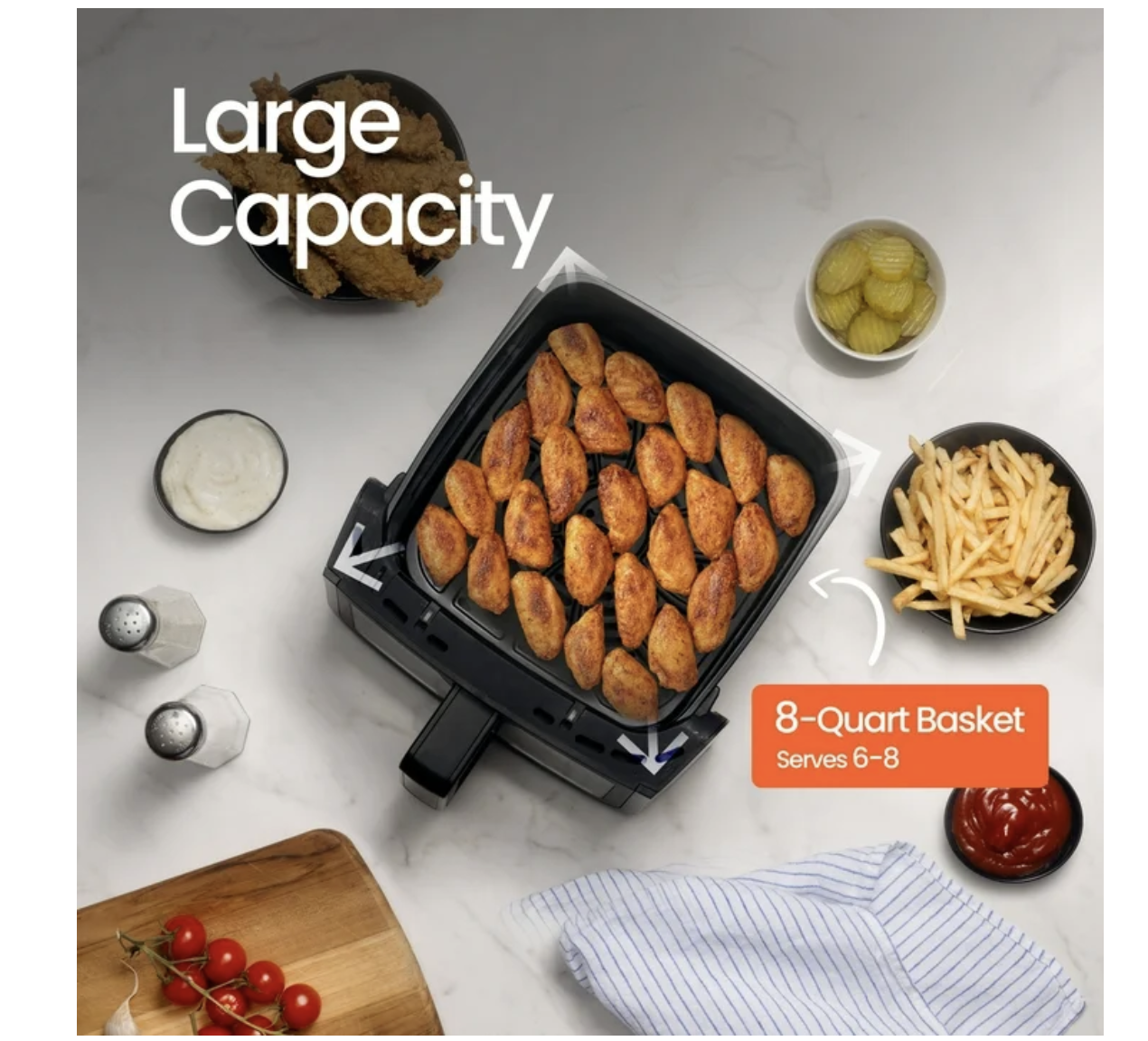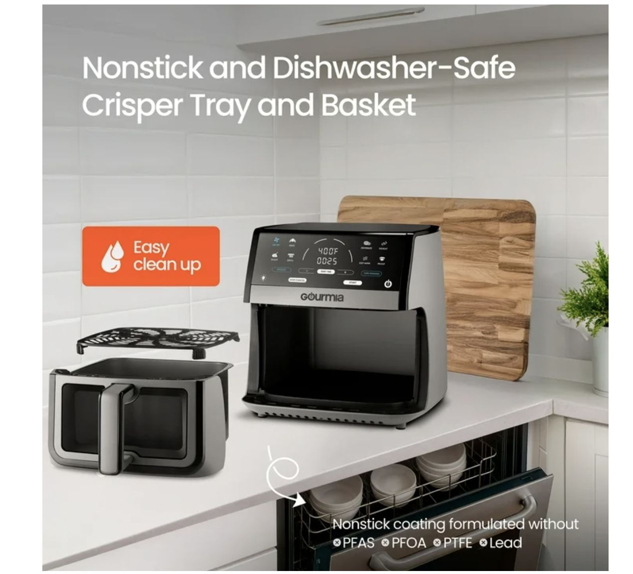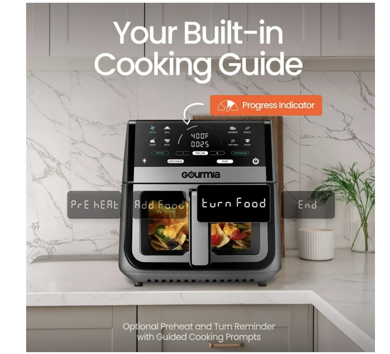 Brand new in box, Gourmia 8 Qt Digital Window Air Fryer with 8 One-Touch Cooking Functions, Extra-large 8-QT capacity cooks for 6-8 people Multiple dishes are one tap away with 8 One-Touch Cooking Functions FryForce 360° Technology™ fries with air for up to 80% less fat Window and light let you monitor food at-a-glance An optional Preheat and Turn Food Reminder achieve delicious results Guided Cooking Prompts offer helpful display messages and alerts Dishwasher-safe nonstick basket and crisper tray for easy cleanup Gourmia With its extra-large 8 qt capacity, you can cook for 6–8 people at once. Easily monitor your food with the built-in viewing window and interior light—no need to open the basket while cooking. Powered by FryForce 360° Technology™, this air fryer uses fast, even air circulation to deliver crispy, golden results without all the oil. Choose from 8 one-touch cooking functions, including Air Fry, Bake, Roast, Broil, Dehydrate, and Proof, for versatile, all-in-one convenience. Features like optional preheat, Turn Food reminders, and Guided Cooking Prompts make every meal easy and stress-free