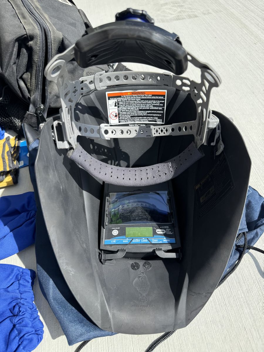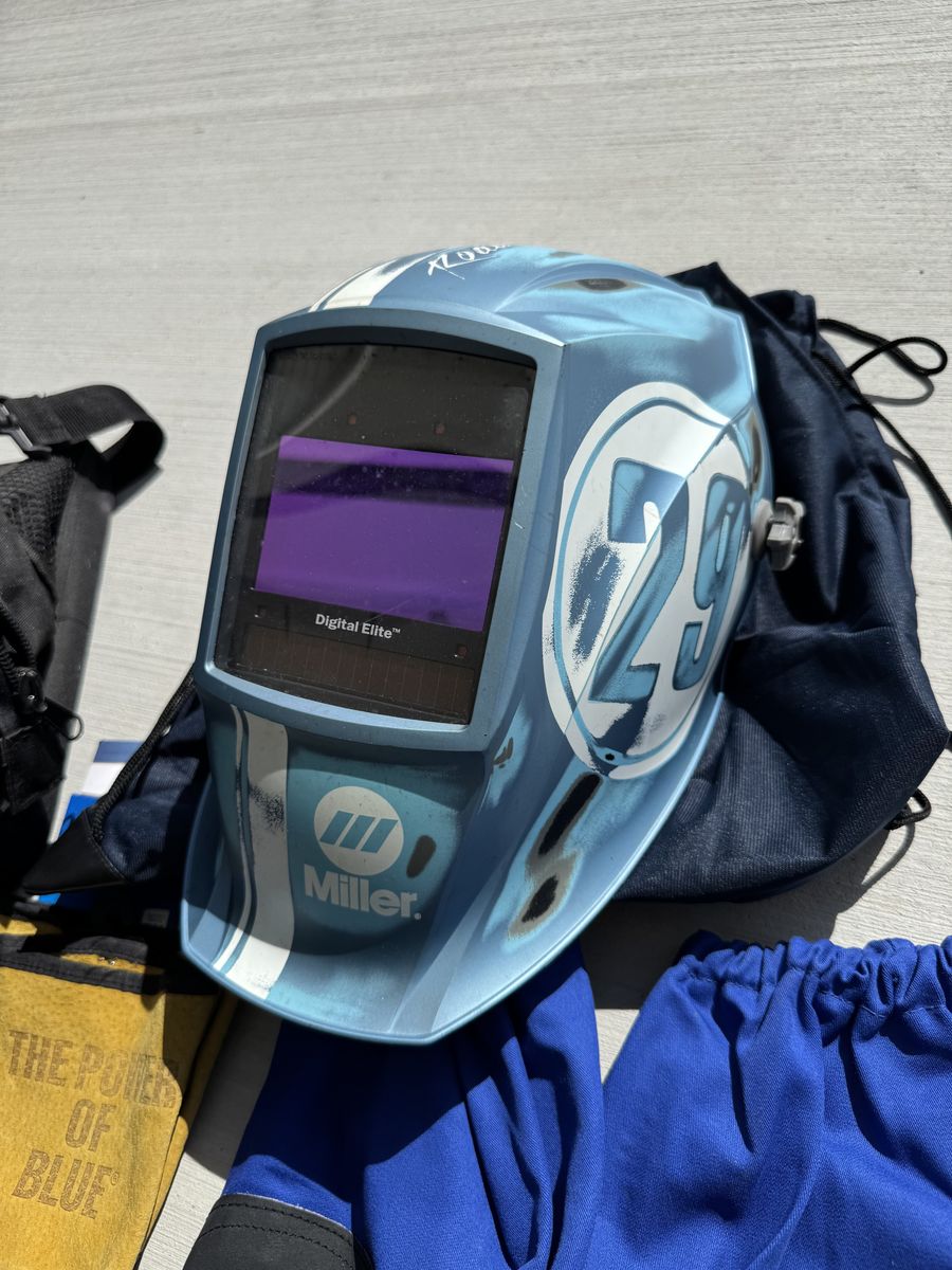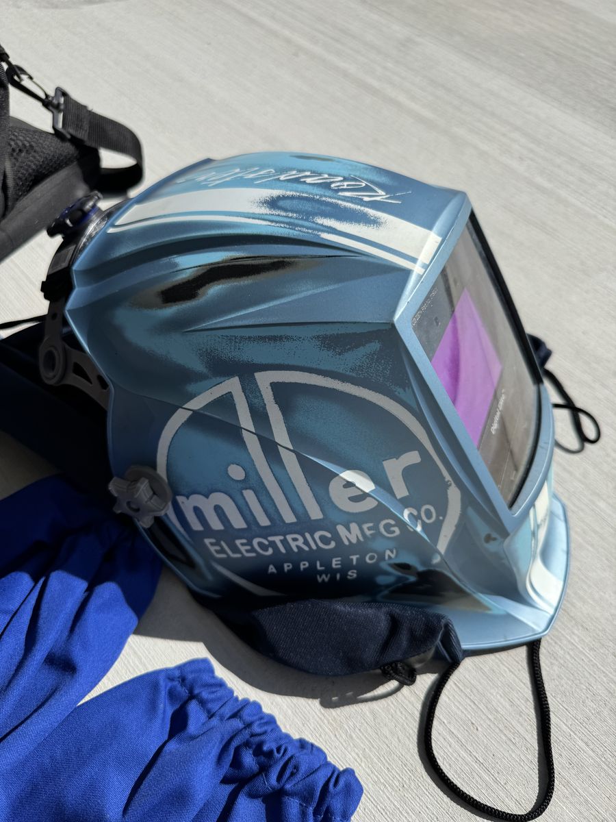 This is a sweet auto darkening welding helmet. The design is called Vintage Roadster. Miller tool bag, miller gloves 2 pairs XL, miller combo leather welding sleeves, misc small tools (picture) everything is like new or new. This is a sweet setup very lightly used for welding school. The value of this package is almost $600. Text with any questions. Pickup in Tremonton.
