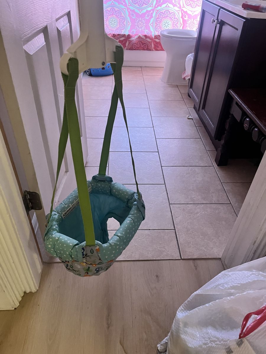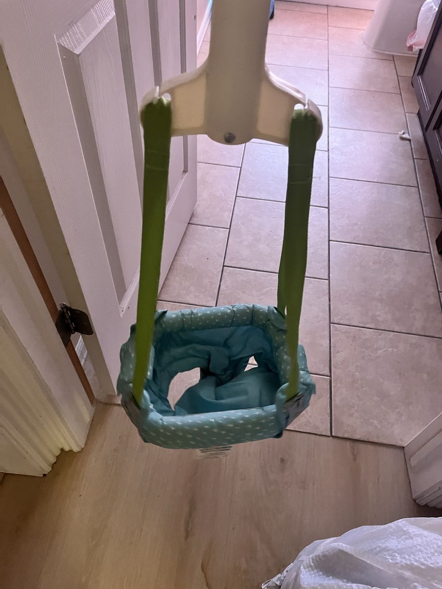 Door frame hooked baby jumper, like new only used for a small amount of time, great for baby up to 30lbs and great for baby’s to gain strength in their legs.