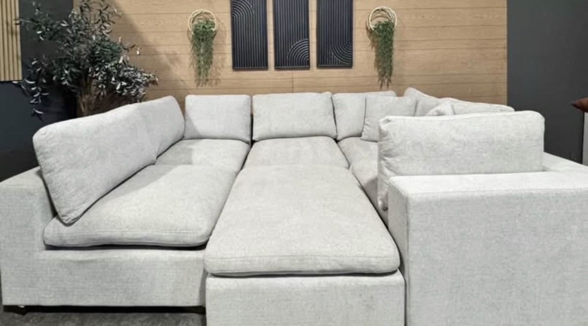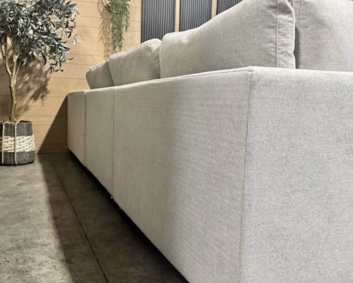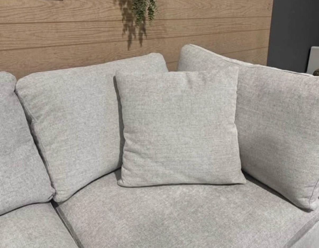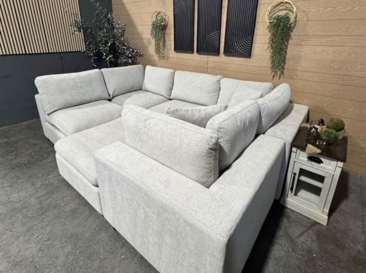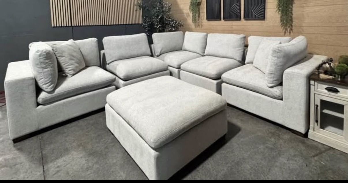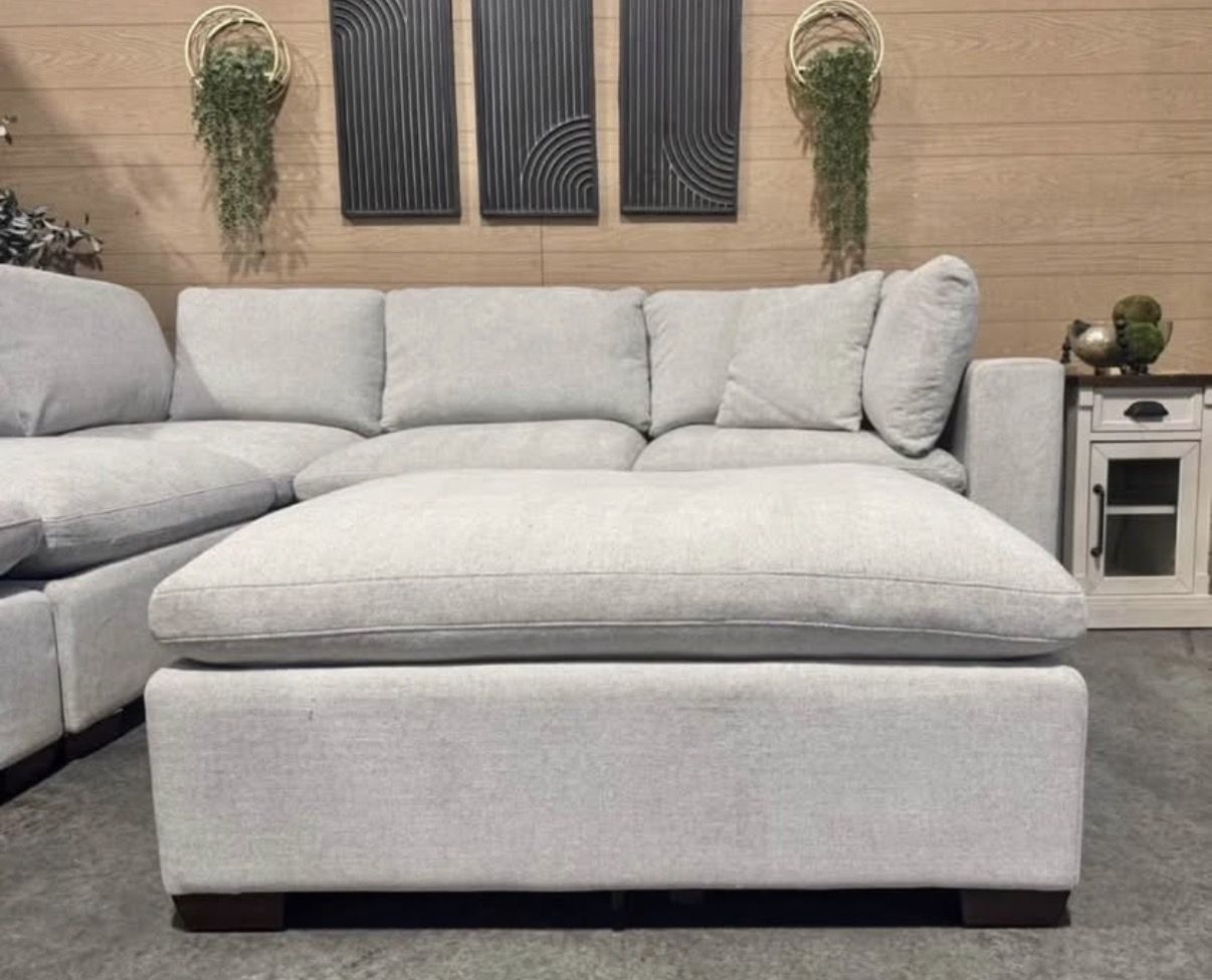 The Thomasville Lowell Modular Sectional is well-loved for its settle-in comfort cushions, deep seats, and various configurations. The sectional and ottoman are upholstered in a smooth fabric that is composed of durable fibers. Three toss pillows, covered in the same smooth fabric, are included. The comfort goes beyond the fabric and to the cushions that provide a relaxed look and casual seating experience. The sectional cushions are removable and reversible which allows for easy fluffing and quick cleaning when needed. Solid wood legs, in a rich walnut brown finish, stand at a low profile to compliment the deep seats and complete the frame. The six pieces can be arranged in multiple configurations to provide a custom fit for your space. Whichever configuration is chosen, the large scale of this sectional will comfortably accommodate many friends and family members.