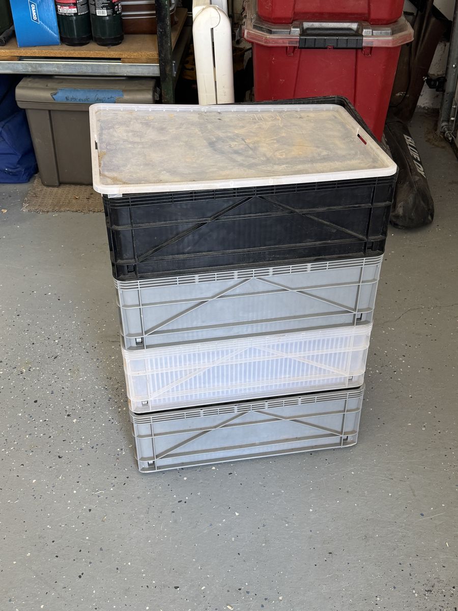 As per description: well used, perfectly functional, they stack, one Lid only, 4 boxes. CASH. $60 for all 4