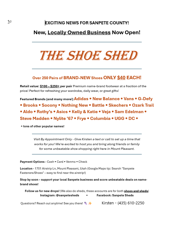 Stop by soon – support your local Sanpete business and score unbeatable deals on name-brand shoes!