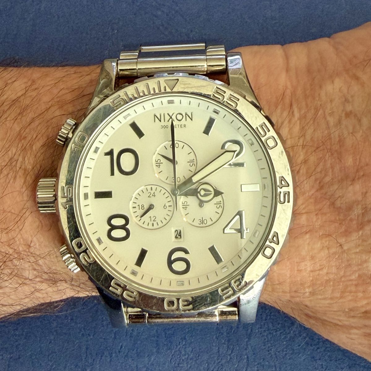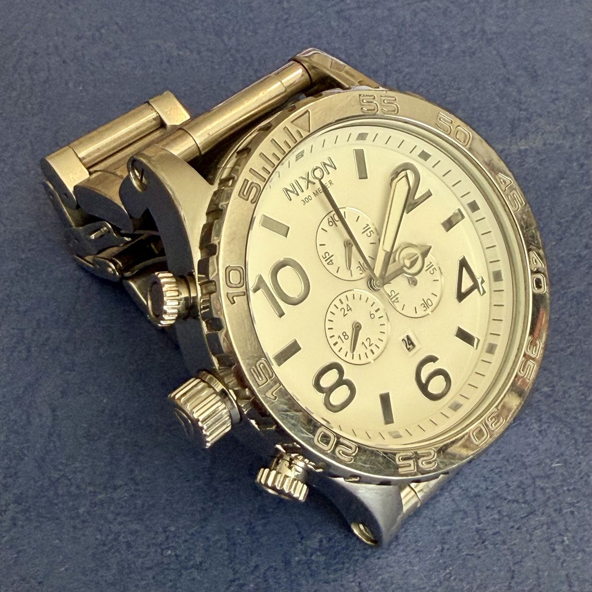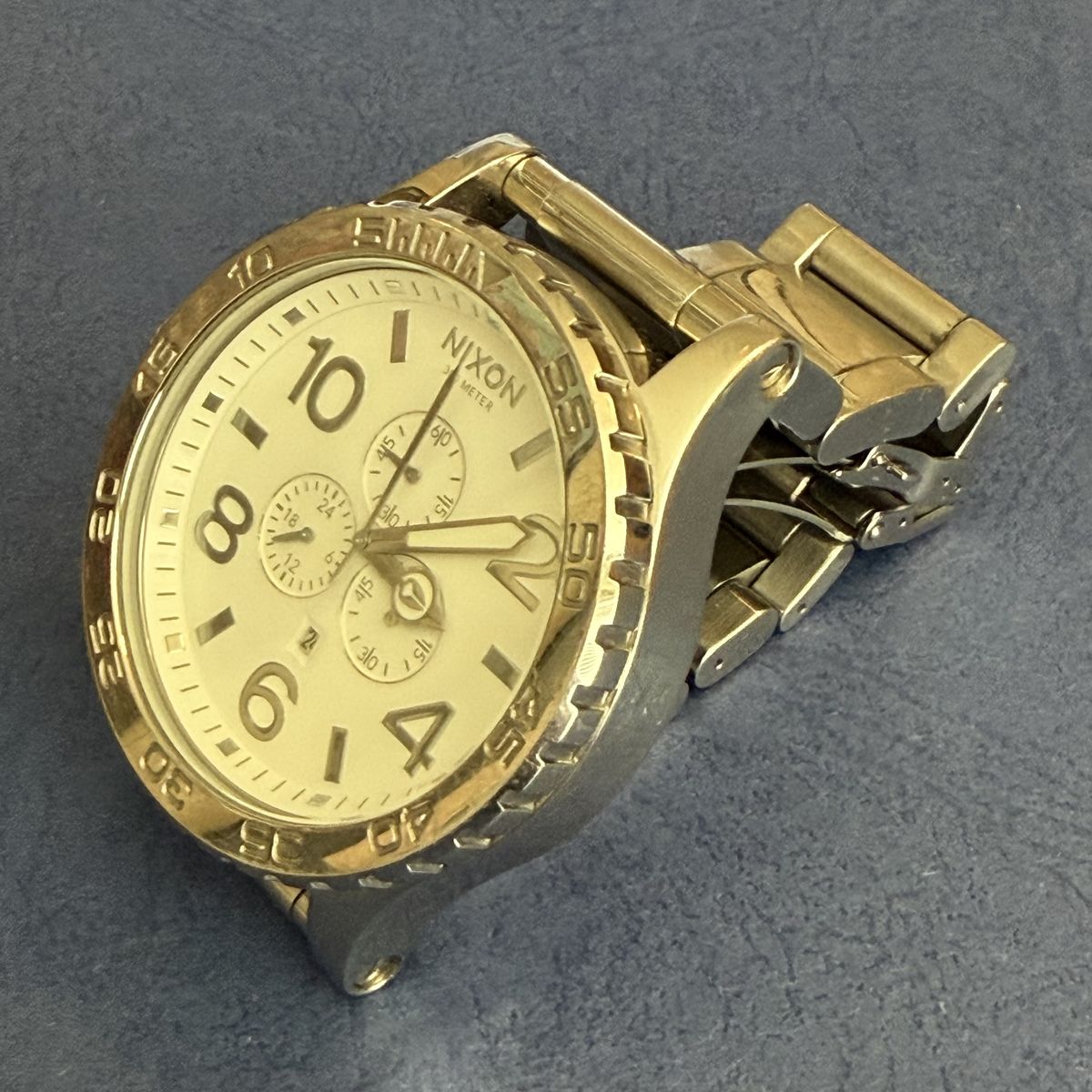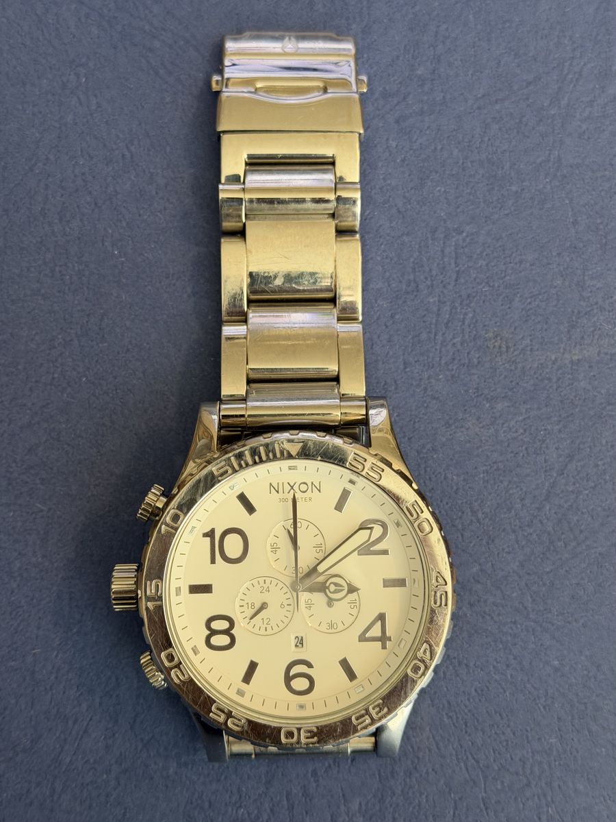 VenmoIconic Nixon chronograph watch. It's BIG at 51mm. This watch is in good shape with no scratches on the crystal. There are some surface scratches on the band and case, but overall it's in great shape. New battery on 3/24/26. These watches have the crown and pushers on the opposite side but can be worn comfortably on either the right or left wrist. As you know if you're looking, these watches still go for over $500 new.