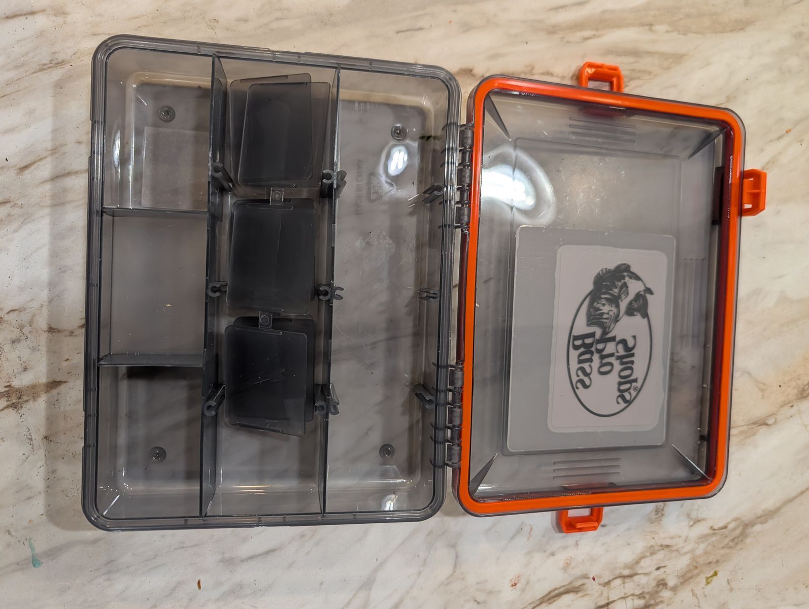 We know your lures are an investment. Keep them safe by stowing them in the Bass Pro Shops Watertight Utility Box. 4 sturdy latches lock the lid tightly in place, while a precision-fitted rubber gasket forms a watertight seal that locks out moisture and preserves dry air inside. Each box features rugged plastic construction built for lasting performance on the water and in storage. Included dividers allow flexible organization: 3500 size adjusts from 5 to 11 compartments. Dependable protection and customizable space make these tackle boxes a trusted companion for any angler's gear. Dark smoke tint protects fishing lure finishes. One latch no longer connects to the lid, but can still be used to latch the top down. It is not necessary for a good seal. Some tackle included to get you started.