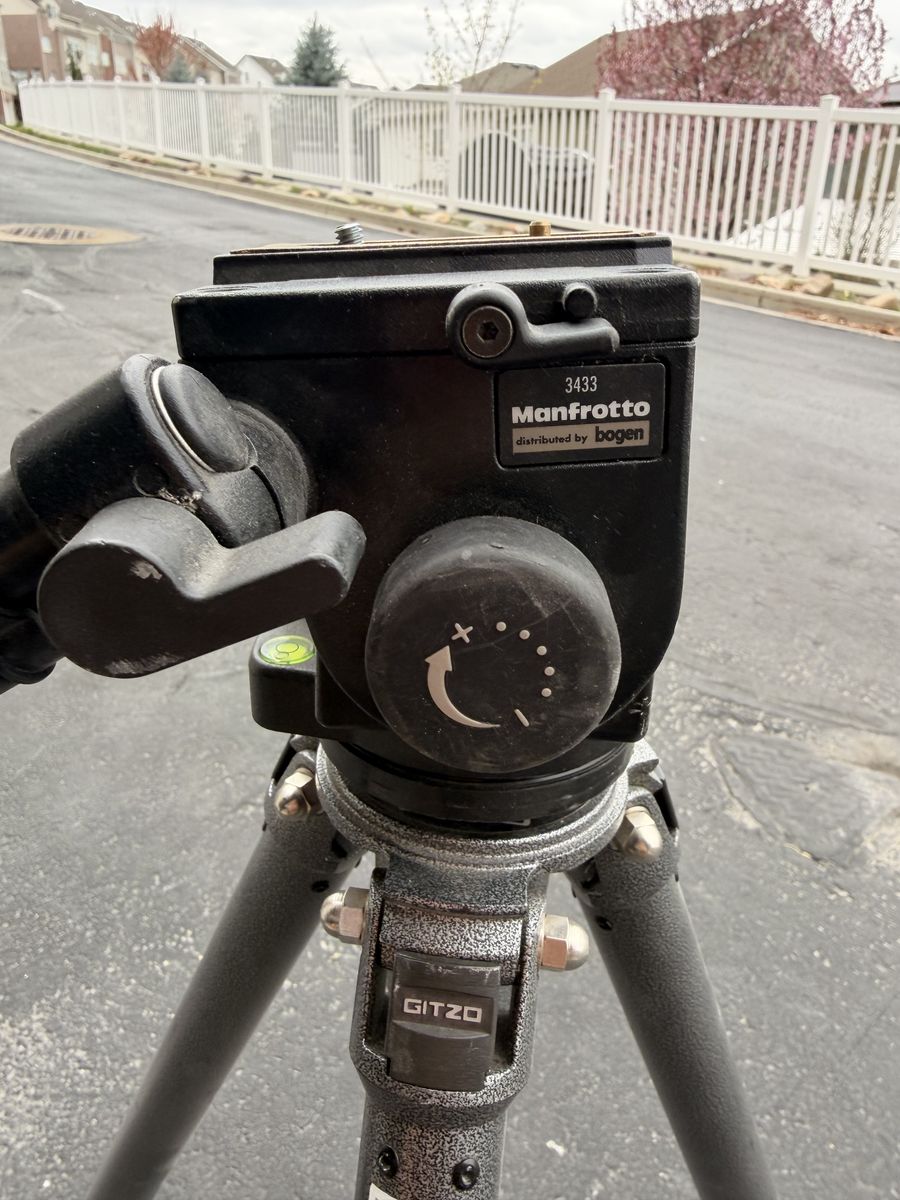 CashAppVintage professional tripod setup featuring a Gitzo G320 (Made in France) paired with a Manfrotto 3433 fluid video head (Bogen branded).