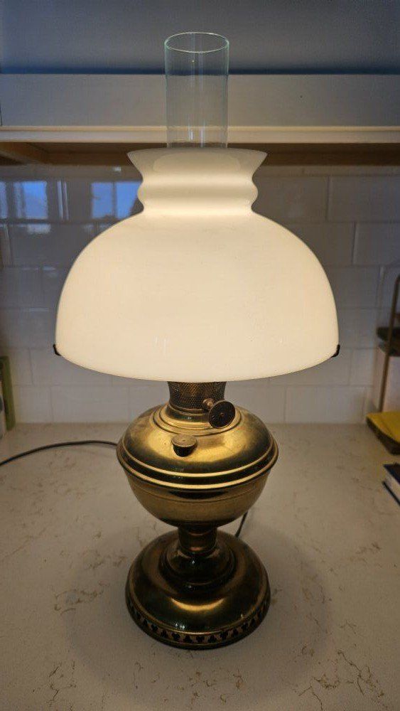 Beautiful Vintage Brass and Milk Glass Lamp With Hurricane. This Lamp Is In Excellent Working Condition.