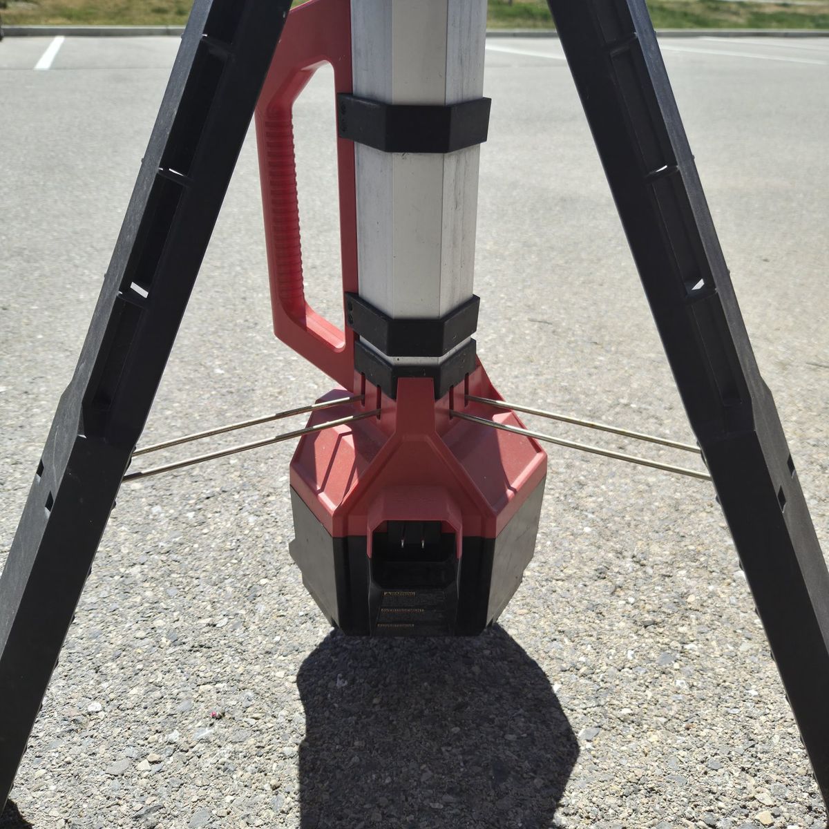 Adjustable tripod base and extends up to about 7 feet. Runs on M18 battery or standard plug. Folds down easily for transport and storage.