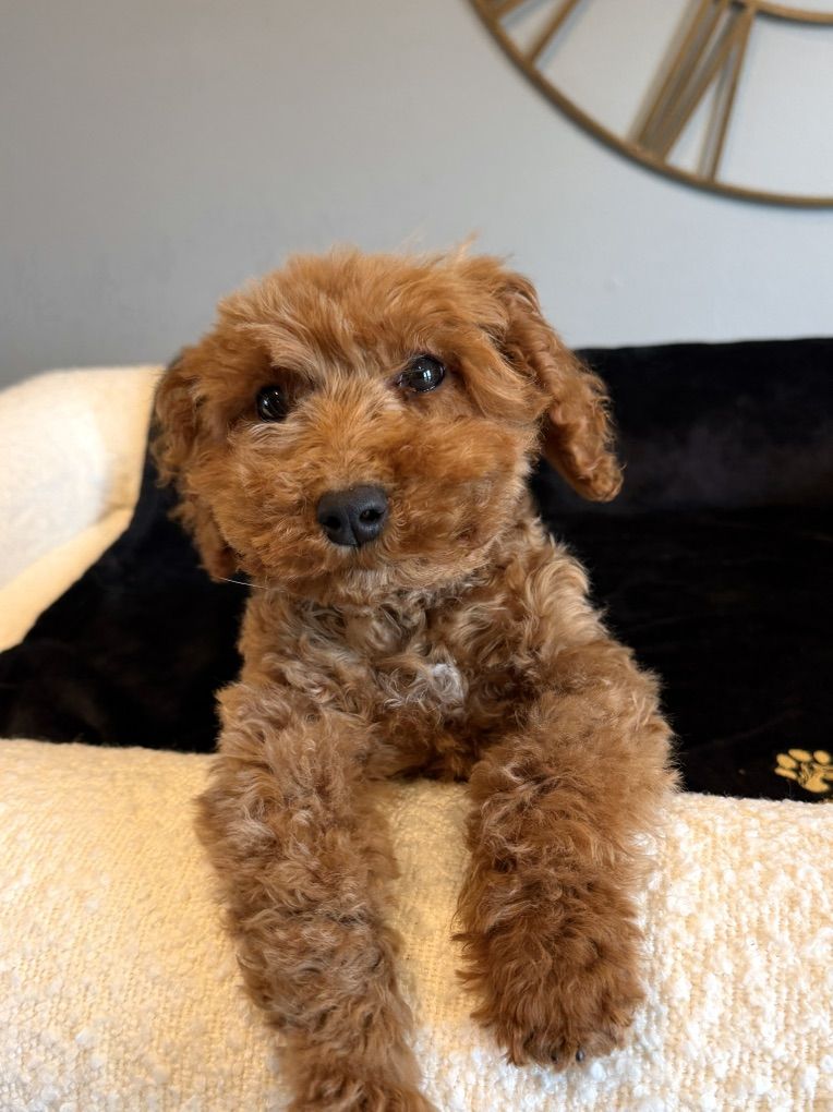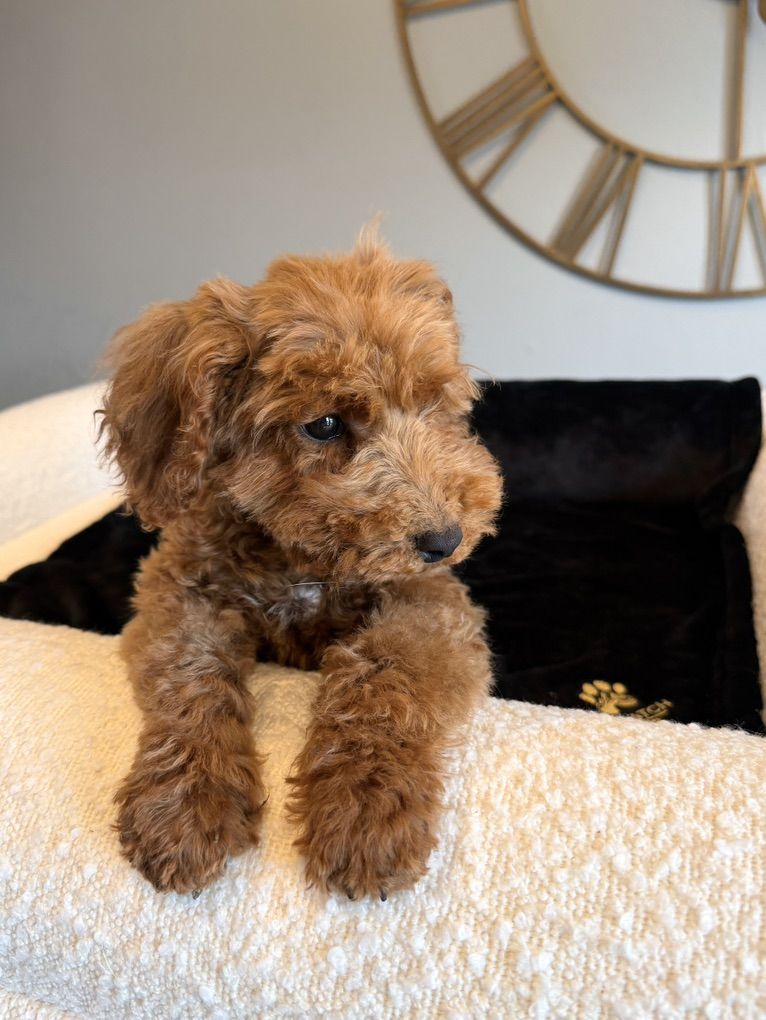 This little goldendoodle will be 12-15 pounds full grown with mom being 15 pounds and dad 10!
