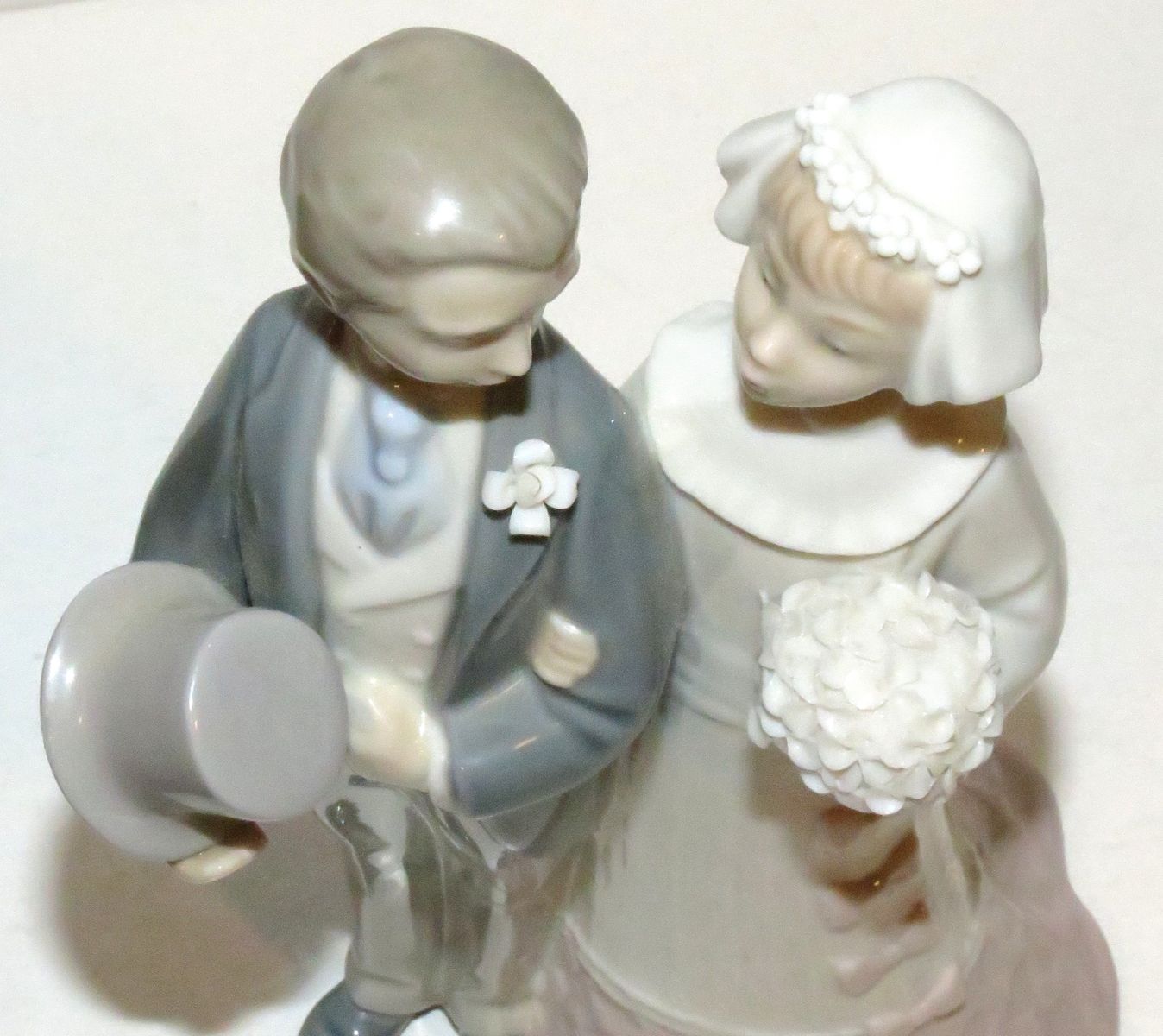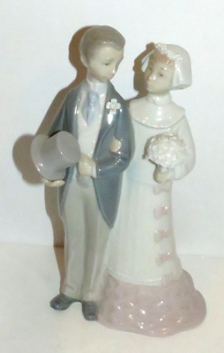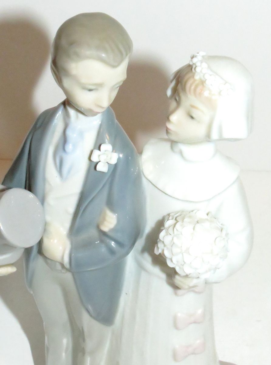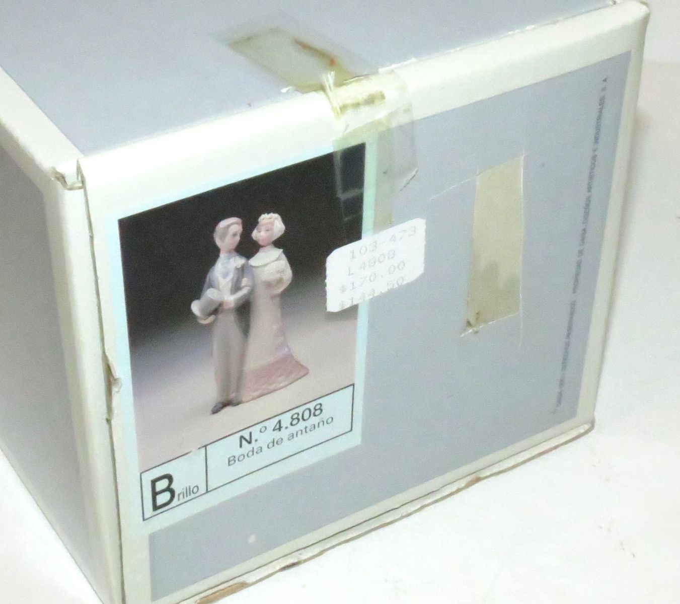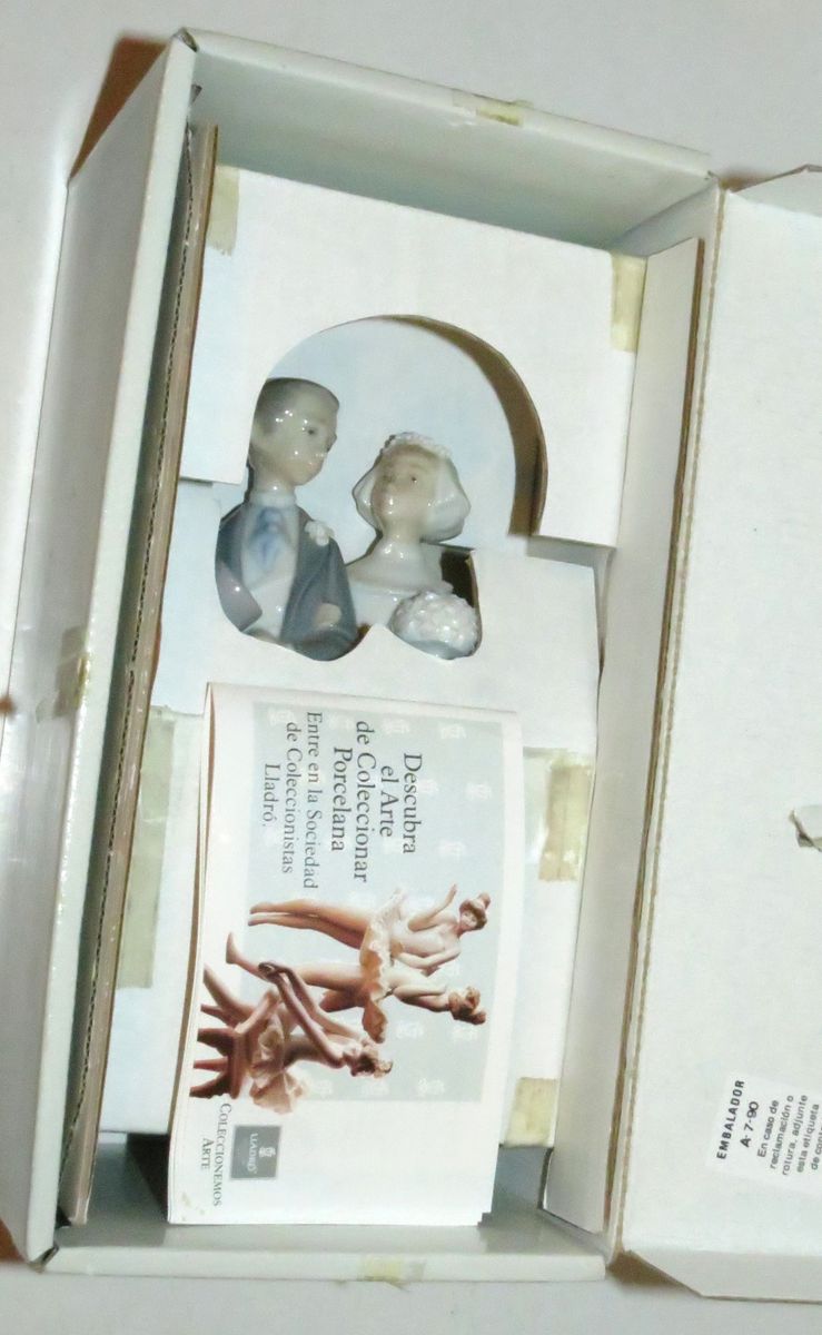 VenmoLladro #4808, Wedding Bride and Groom. In box, with booklet! Only flaw noted - there's few petals that are missing from the bride's bouquet. Hard to pic out, but looks like there's one trio of them that came off, with maybe the extreme edge of an adjacent petal chipped (seen under magnification). Box has some old scotch tape residue, and a cutout on one end - see pic. Bit of grit seen around man's shoe in one pic brushed off easily.