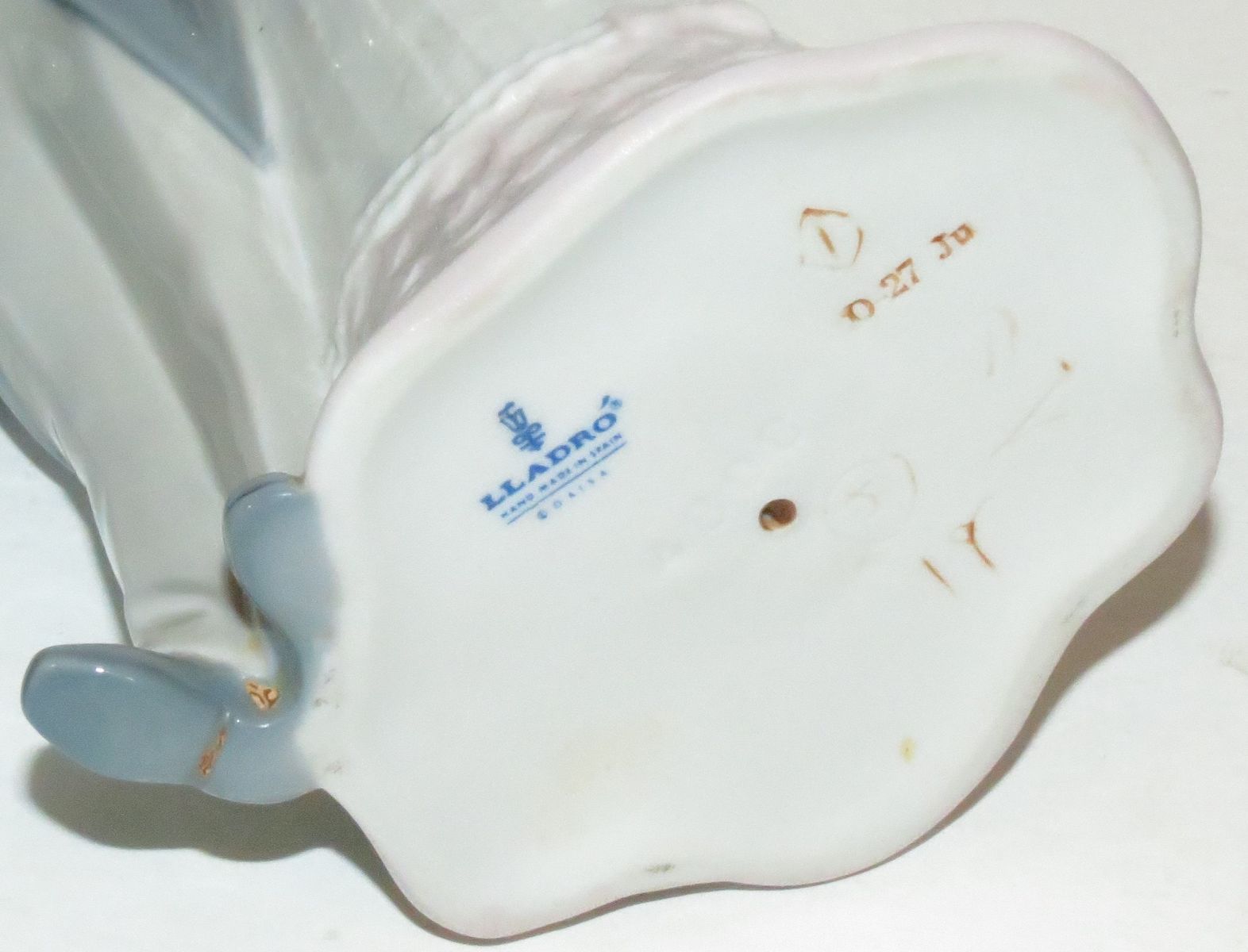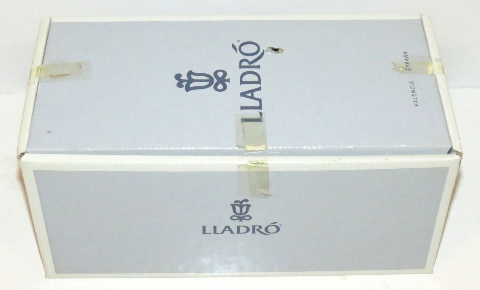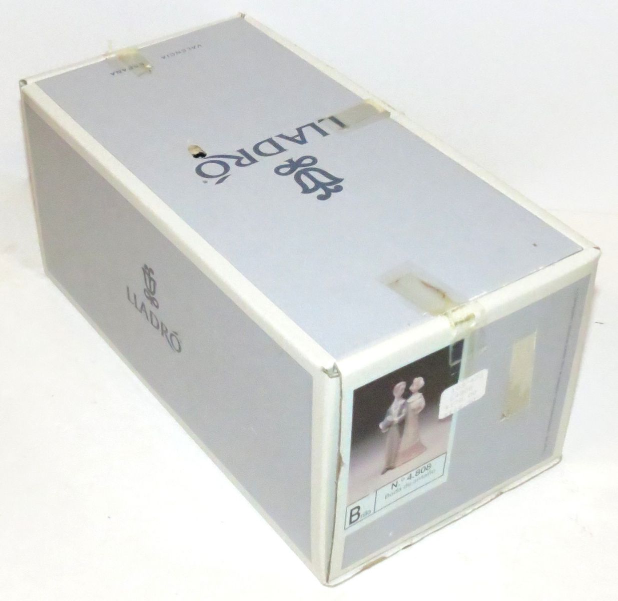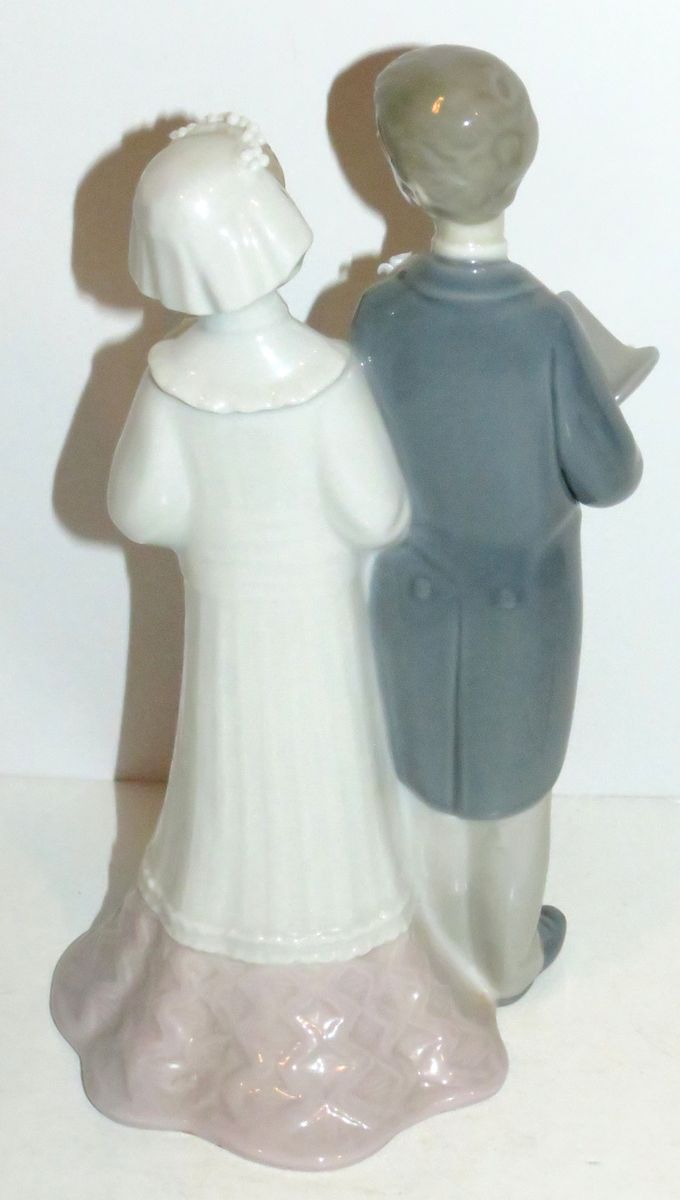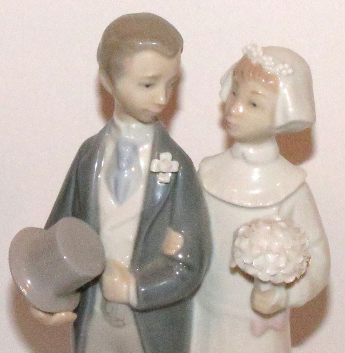 VenmoLladro #4808, Wedding Bride and Groom. In box, with booklet! Only flaw noted - there's few petals that are missing from the bride's bouquet. Hard to pic out, but looks like there's one trio of them that came off, with maybe the extreme edge of an adjacent petal chipped (seen under magnification). Box has some old scotch tape residue, and a cutout on one end - see pic. Bit of grit seen around man's shoe in one pic brushed off easily.