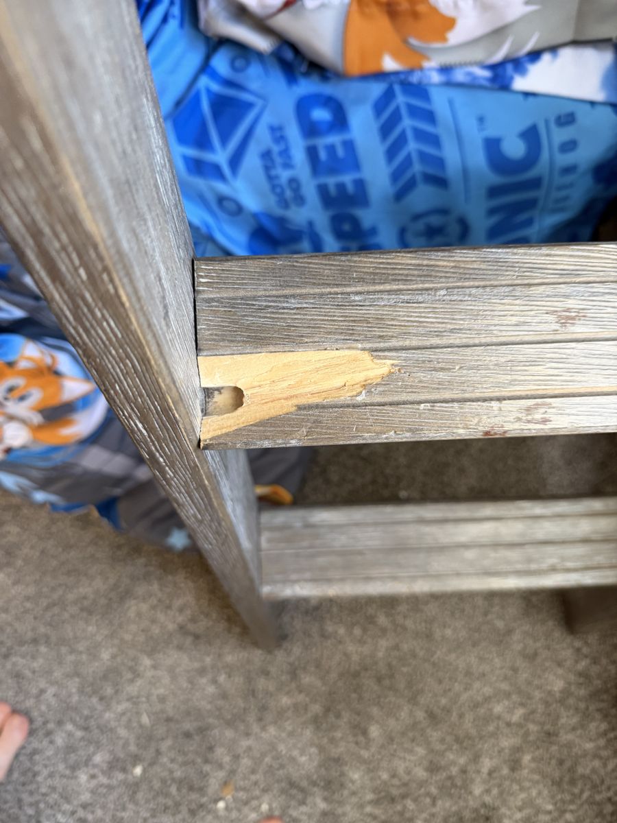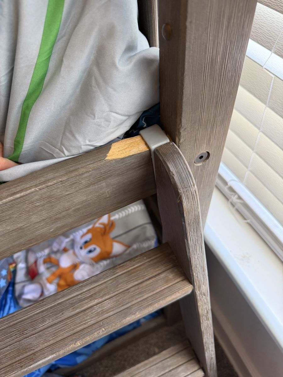 VenmoThe bunk bed itself is solid and study. Perfect for younger kids since it’s lower to the ground. The ladder has a piece of wood missing on the step and where it attaches ( see pictures). Probably could fill it with wood filler and some paint. 75$ obo.