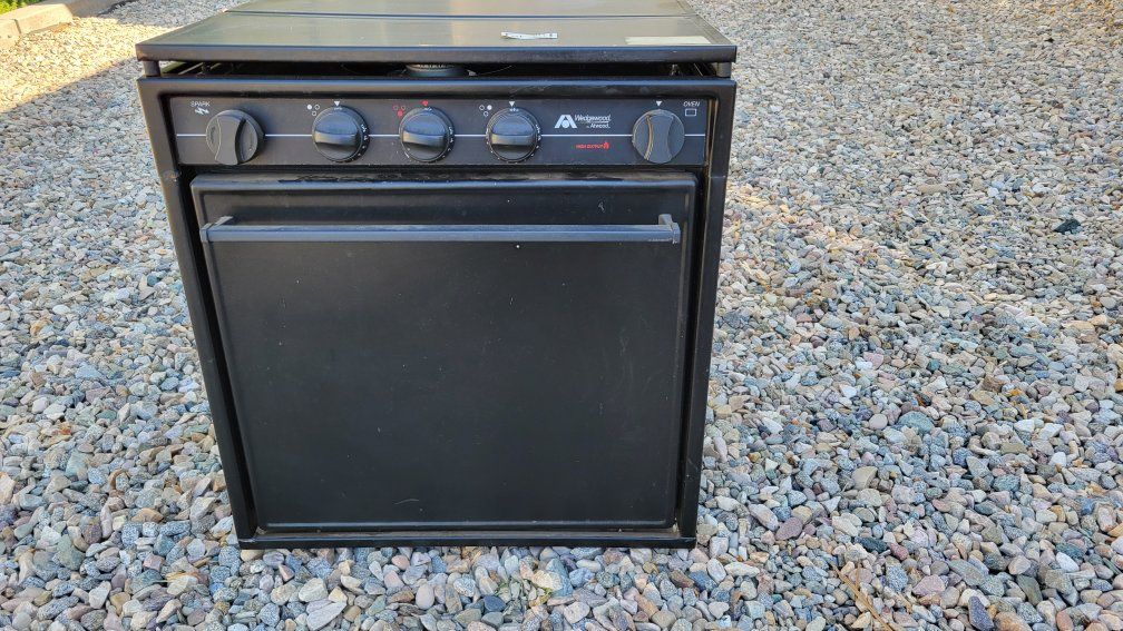 RV 3 burner stove with oven. It is in good condition comes with the fan that goes above it. measurements are in the pictures.