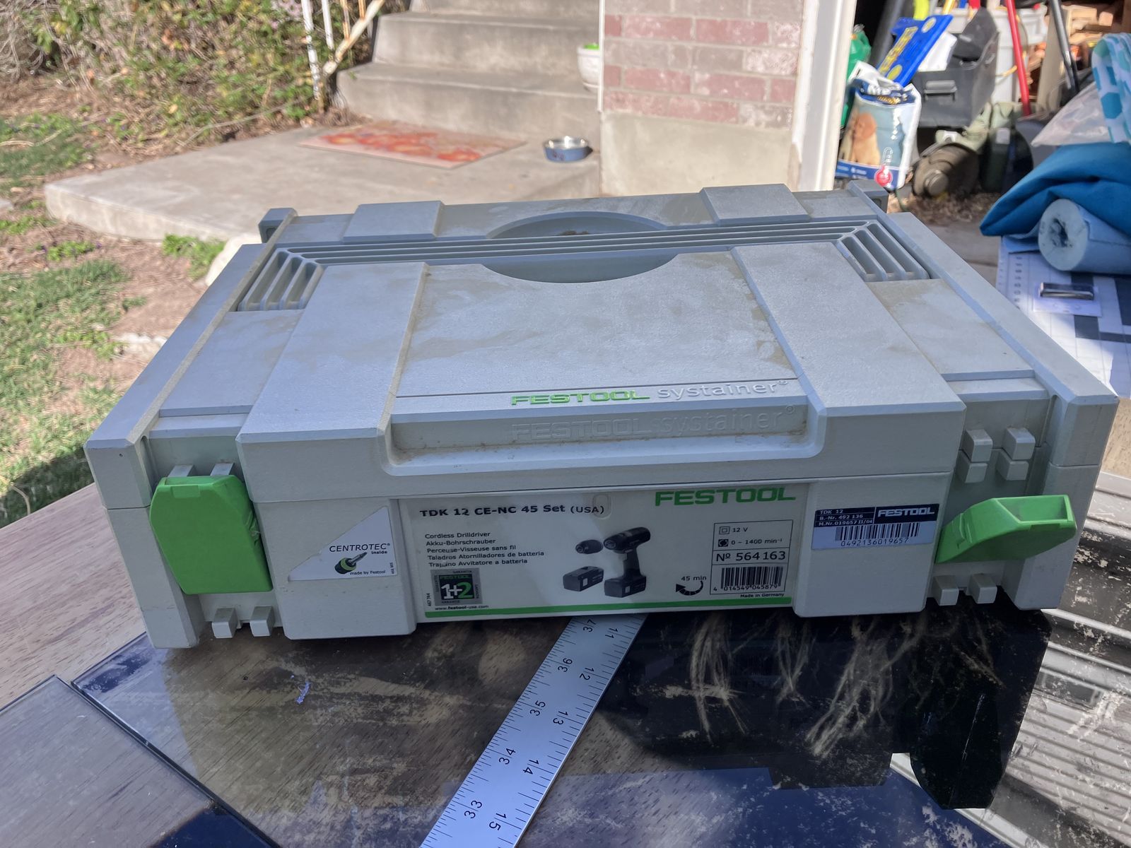 PayPalThis is a Festool TDK 12 cordless drill driver set, which includes the drill, a battery pack, and a charger in a Systainer case. Model: Festool TDK 12. Voltage: 10.8 V. Speed: Two-speed gearbox with speeds up to 1300 RPM. Features: Includes the CENTROTEC quick-change chuck system for fast bit changes. Battery Type: NiCd (Nickel-Cadmium).