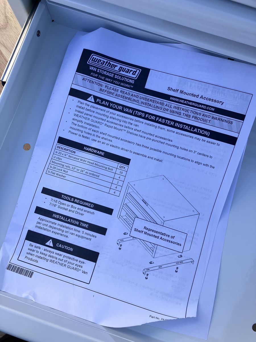 Features: High-quality, durable mechanics-grade van storage cabinet Includes 4 van storage drawers with easy-to-grip handles Latches on each drawer stay closed even when cabinet is unlocked Smooth ball-bearing rollers on van storage drawers Stacks with other 16 inch wide van storage cabinets Mounting brackets are not included. Order Model 9993-3-01 mounting bracket for 13in deep shelves, or Model 9996-3-01 mounting bracket for 16in deep shelves Brite White ARMOR TUF Powder Coat finish ensures years of dependability